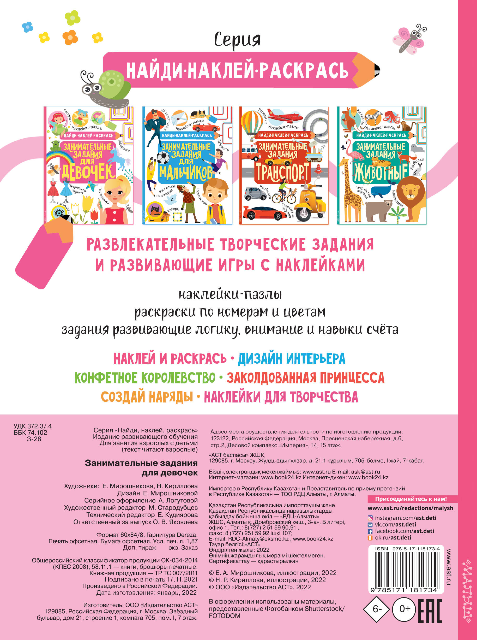 Несколько часов вашего свободного времени под одной обложкой. Серия развивающих альбомов с наклейками "Найди, наклей, раскрась" займёт ребёнка полезным и увлекательным делом на целый день. Большой, но лёгкий активити-альбом развивает логику, фантазию, навыки счёта. В книге "Занимательные задания для девочек" разнообразие творческих заданий со сказочными принцессами: - раскраски - наклейки-пазлы - головоломки - лабиринты - наклейки для творчества - задания на внимание и развитие навыков счёта| Издательство | ИЗДАТЕЛЬСТВО "АСТ" |