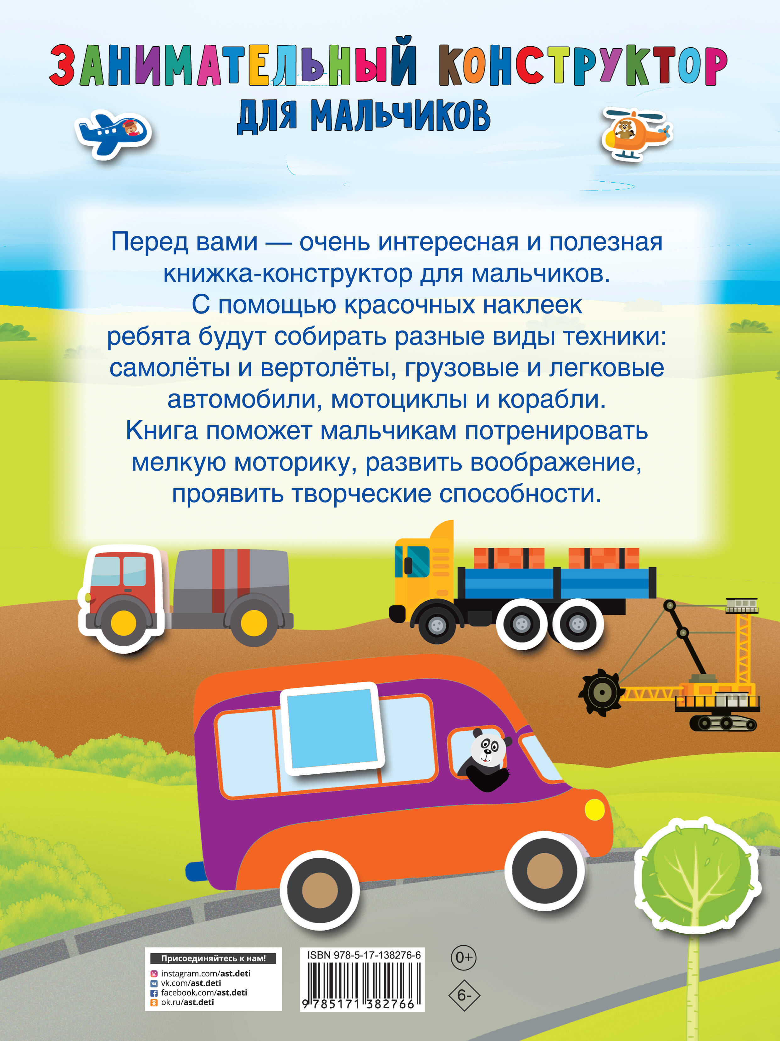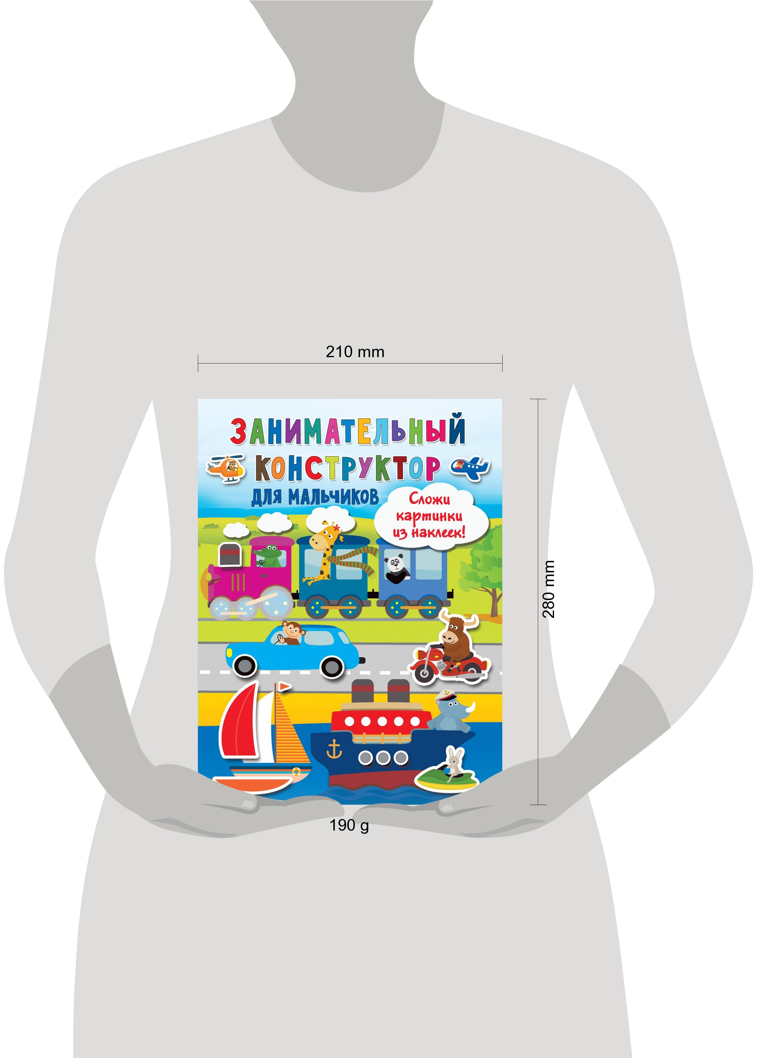 О чём эта книга «Занимательный конструктор для мальчиков» - это красочная книжка-игра для мальчиков. Занимаясь по ней, ребята будут собирать из наклеек картинки: животных и технику, растения и сказочных существ. Работа с наклейками способствует развитию воображения ребёнка, мелких движений кистей рук, координации движений. Кому эта книга будет интересна Книжка с наклейками для детей дошкольного возраста. Каковы особенности этой книги • Многоразовые наклейки - если ребёнок ошибся, стикер можно переклеить. • Игра с наклейками надолго займёт малыша. • Занимаясь по книге, ребёнок весело и с пользой проведёт свободное время.| Издательство | ИЗДАТЕЛЬСТВО "АСТ" |