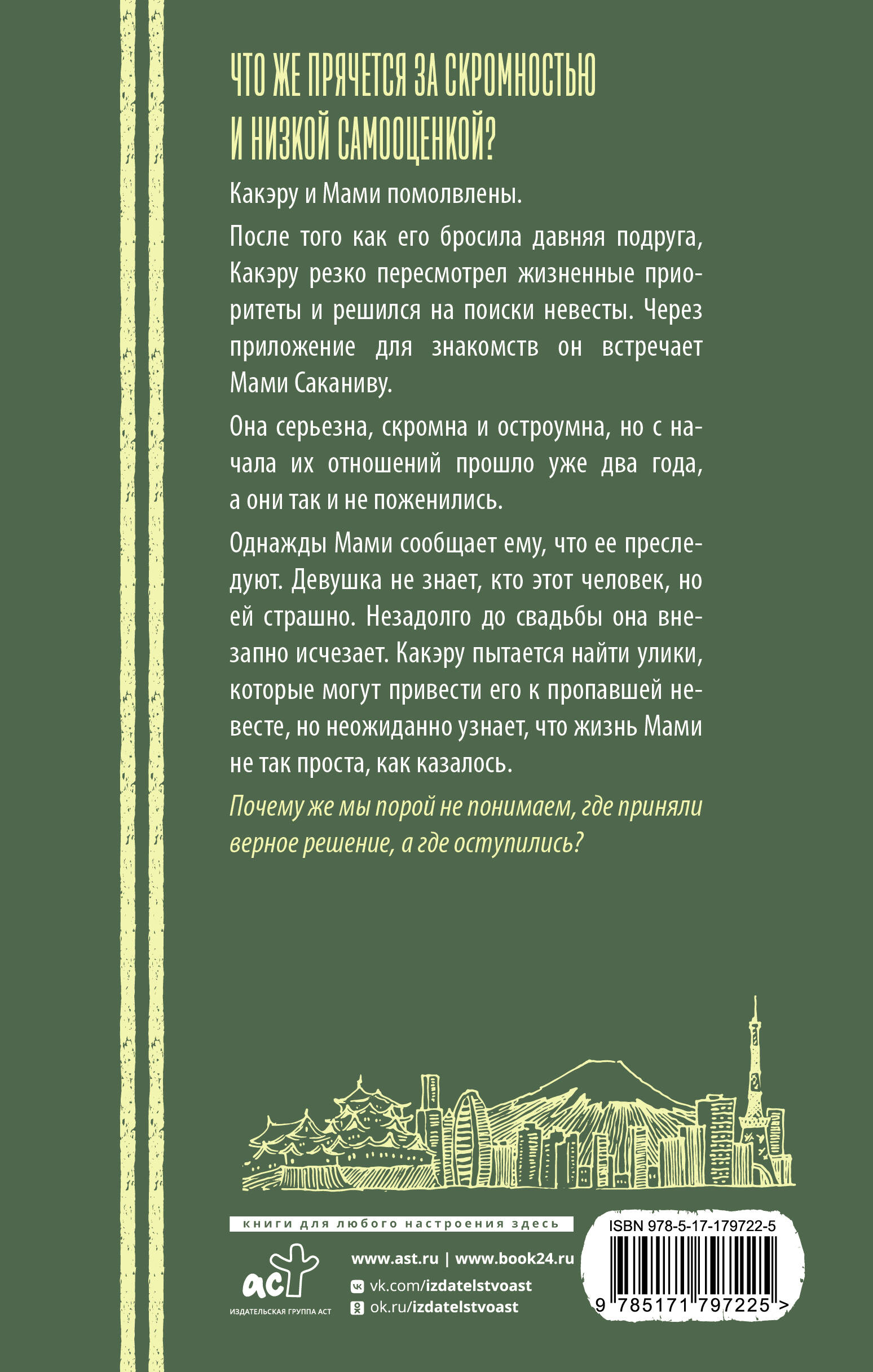 Какэру и Мами помолвлены. После того как его бросила давняя подруга, Какэру резко пересмотрел жизненные приоритеты и решился на поиски невесты. Через приложение для знакомств он встречает Мами Саканиву. Она серьезна, скромна и остроумна, но с начала их отношений прошло уже два года, а они так и не поженились. Однажды Мами сообщает ему, что ее преследуют. Девушка не знает, кто этот человек, но ей страшно. Незадолго до свадьбы она внезапно исчезает. Какэру пытается найти улики, которые могут привести его к пропавшей невесте, но неожиданно узнает, что жизнь Мами не так проста, как казалось.| Издательство | Издательство "АСТ" |