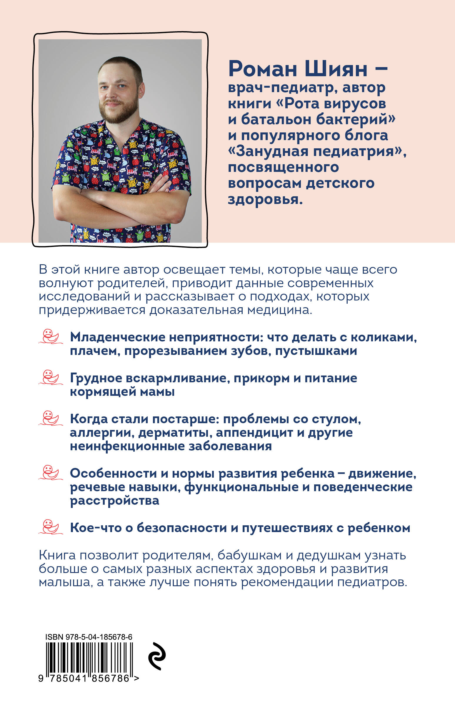 В новой книге врач-педиатр и сторонник доказательного подхода в медицине Роман Шиян собрал наиболее частые, интересные, а иногда и удивительные вопросы о детском здоровье, которые он слышал от своих пациентов и подписчиков. - Младенческие неприятности: что делать с коликами, плачем, прорезыванием зубов, пустышками и т. д. - Грудное вскармливание, прикорм и питание кормящей мамы. - Когда стали постарше: проблемы со стулом, аллергии, дерматиты, аппендицит и другие неинфекционные заболевания. - Особенности и нормы развития ребенка - движение, игрушки, речевые навыки, функциональные и поведенческие расстройства. - Кое-что о безопасности и путешествиях с ребенком. Для родителей, бабушек и дедушек, а также будущих врачей-педиатров.| Издательство | ООО "Издательство "Эксмо" |