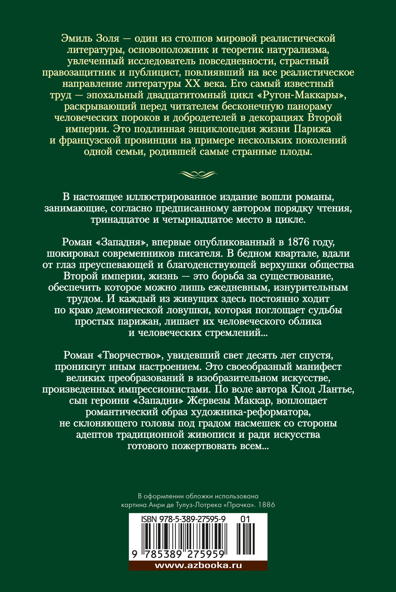 Эмиль Золя - один из столпов мировой реалистической литературы, основоположник и теоретик натурализма, увлеченный исследователь повседневности, страстный правозащитник и публицист, повлиявший на все реалистическое направление литературы XX века. Его самый известный труд - эпохальный двадцатитомный цикл "Ругон-Маккары", раскрывающий перед читателем бесконечную панораму человеческих пороков и добродетелей в декорациях Второй империи. Это подлинная энциклопедия жизни Парижа и французской провинции на примере нескольких поколений одной семьи, родившей самые странные плоды. В настоящее иллюстрированное издание вошли романы, занимающие, согласно предписанному автором порядку чтения, тринадцатое и четырнадцатое место в цикле. Роман "Западня", впервые опубликованный в 1876 году, шокировал современников писателя. В бедном квартале, вдали от глаз преуспевающей и благоденствующей верхушки общества Второй империи, жизнь - это борьба за существование, обеспечить которое можно лишь ежедневным, изнурительным трудом. И каждый из живущих здесь постоянно ходит по краю демонической ловушки, которая поглощает судьбы простых парижан, лишает их человеческого облика и человеческих стремлений… Роман "Творчество", увидевший свет десять лет спустя, проникнут иным настроением. Это своеобразный манифест великих преобразований в изобразительном искусстве, произведенных импрессионистами. По воле автора Клод Лантье, сын героини "Западни" Жервезы Маккар, воплощает романтический образ художника-реформатора, не склоняющего головы под градом насмешек со стороны адептов традиционной живописи и ради искусства готового пожертвовать всем…| Издательство | Азбука-Аттикус Издат.группа ООО |