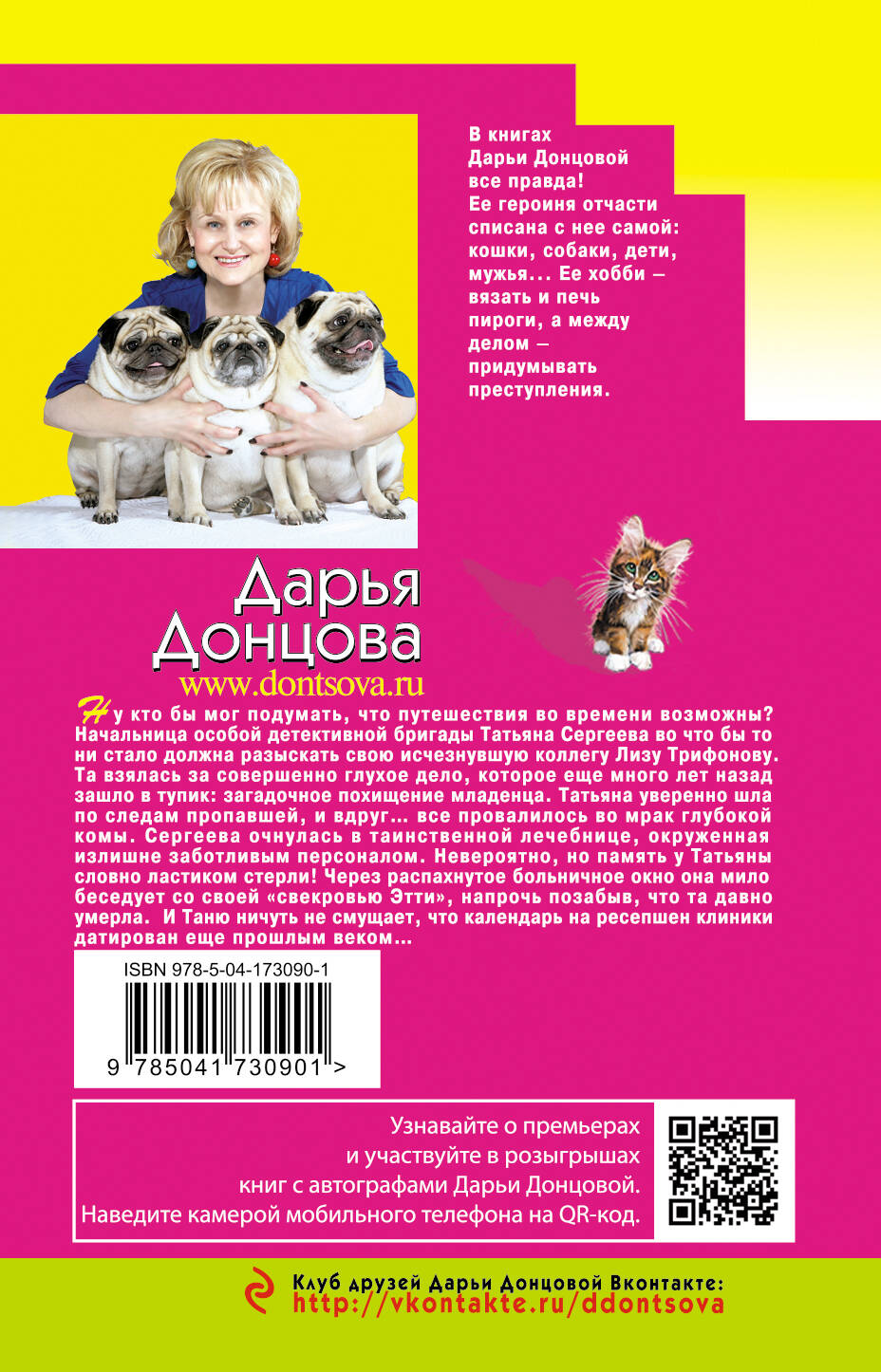 Ну кто бы мог подумать, что путешествия во времени возможны?... Начальница особой детективной бригады Татьяна Сергеева во что бы то ни стало должна разыскать свою исчезнувшую коллегу Лизу Трифонову. Та взялась за совершенно глухое дело, которое еще много лет назад зашло в тупик: загадочное похищение младенца. Татьяна уверенно шла по следам пропавшей, и вдруг… все провалилось во мрак глубокой комы. Сергеева очнулась в таинственной лечебнице, окруженная излишне заботливым персоналом. Невероятно, но память у Татьяны словно ластиком стерли! Через распахнутое больничное окно она мило беседует со своей «свекровью Этти», напрочь позабыв, что та давно умерла. И Таню ничуть не смущает, что календарь на ресепшен клиники датирован еще прошлым веком… Дарья Донцова - самый популярный и востребованный автор в нашей стране, любимица миллионов читателей. В России продано более 200 миллионов экземпляров ее книг. Детективы Дарьи Донцовой написаны в особой манере: помимо интереснейшего сюжета, в них всегда присутствует тонкий юмор, здравый оптимизм и безусловная вера в торжество добра над злом. Это всё, что нужно для отдыха, релаксации и душевного успокоения. Прочтите книги Дарьи, и ваши сердца и души наполнятся светом, оптимизмом, радостью, уверенностью в завтрашнем дне! Они заразят вас желанием жить, радоваться каждому дню и верить в лучшее. -------------------------------------------------- «Донцова невероятная работяга! Я не знаю ни одного другого писателя, который столько работал бы. Я отношусь к ней с уважением, как к образцу писательского трудолюбия. Женщины нуждаются в психологической поддержке и получают ее от Донцовой. Я и сама в свое время прочла несколько романов Донцовой. Ее читают очень разные люди. И очень занятые бизнес-леди, чтобы на время выключить голову, и домохозяйки, у которых есть перерыв 15-20 минут между отвести-забрать детей». - Галина Юзефович, литературный критик «У Дарьи вся детективная закваска всего лишь фон для раскрытия характеров, взаимоотношений между людьми. Всегда есть интрига, и до последнего эпизода непонятно, что, как и почему. В этом смысле условия жанра абсолютно выполняются. Дарья Донцова, конечно, одна из лучших». - Дмитрий Харатьян «Давно начала читать, и так втянулась! И сейчас читаю романы Дарьи. Я отдыхаю за ними. Сама Донцова интеллигентная женщина, у нее мягкий юмор и нестрашный сюжет, все с позитивом и надеждой на хороший конец. Это прекрасно». - Лариса Удовиченко| Издательство | ООО "Издательство "Эксмо" |
