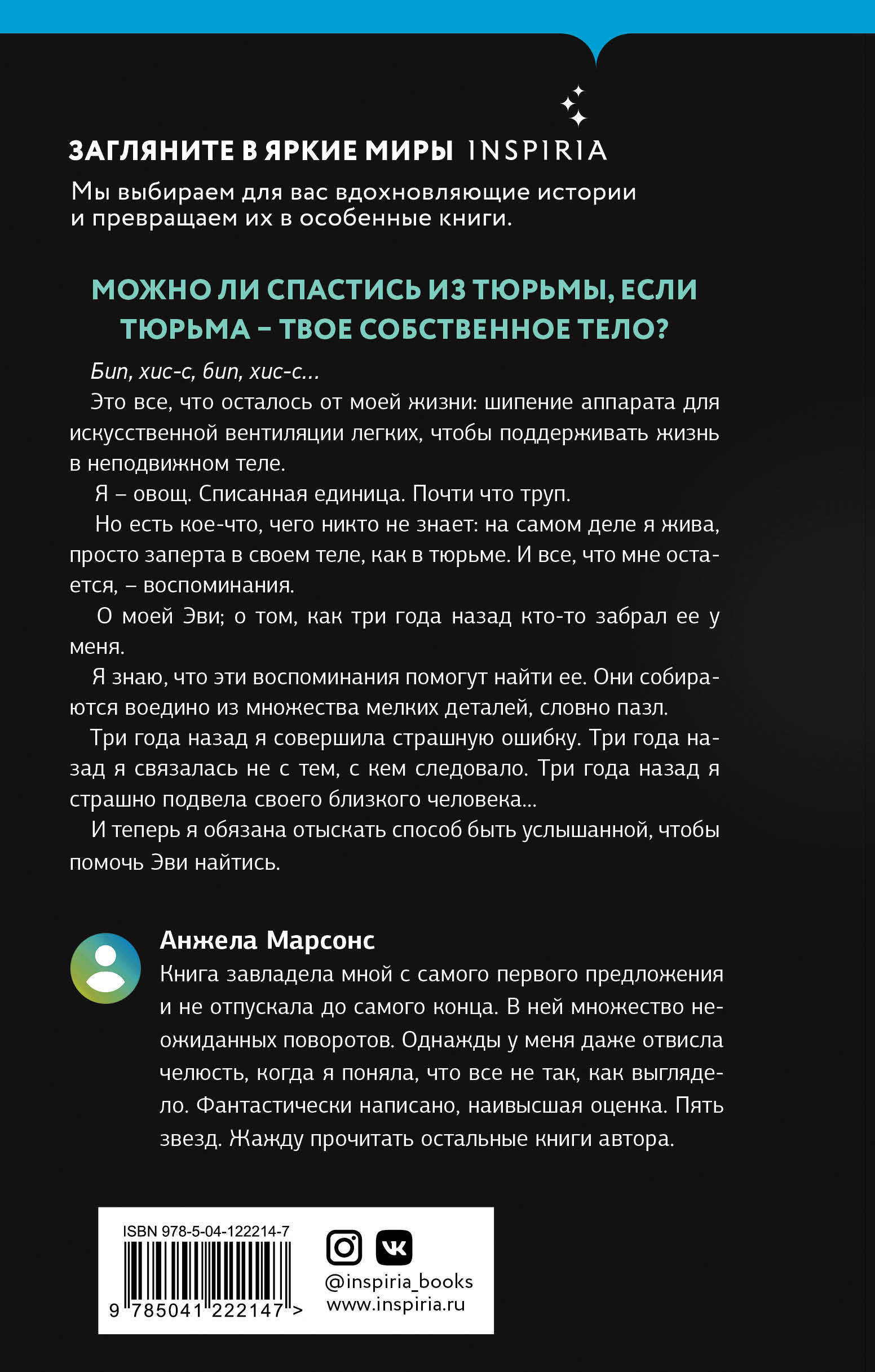 Можно ли спастись из тюрьмы, если тюрьма - твое собственное тело? Бип, хис-с, бип, хис-с… Это - все, что осталось от моей жизни: шипение аппарата для искусственной вентиляции легких, чтобы поддерживать жизнь в неподвижном теле. Я - овощ. Списанная единица. Почти что труп. Но есть кое-что, чего никто не знает: на самом деле я жива, просто заперта в своем теле, как в тюрьме. И все, что мне остается - воспоминания. О моей Эви; о том, как три года назад кто-то забрал ее у меня. Я знаю, что эти воспоминания помогут найти ее. Они собираются воедино из множества мелких деталей, словно пазл. Три года назад я совершила страшную ошибку. Три года назад я связалась не с тем, с кем следовало. Три года назад я страшно подвела своего близкого человека… И теперь я обязана отыскать способ быть услышанной, чтобы помочь Эви найтись. Это история о том, как, в стремлении сбежать от своих проблем, мы разрушаем жизни самых близких… Захватывающий триллер, который не даст уснуть до рассвета. Идеально подходит для любителей романов «Девушка в поезде», «За закрытыми дверями» и «Сестры». «Книга завладела мной с самого первого предложения и не отпускала до самого конца. В ней множество неожиданных поворотов. Однажды у меня даже отвисла челюсть, когда я поняла, что все не так, как выглядело. Фантастически написано, наивысшая оценка. Пять звезд. Жажду прочитать остальные книги автора». - Анжела Марсонс «Блестяще, невероятно закручено… Я смело рекомендую это». - Б.А. Парис, автор книги «За закрытыми дверями»