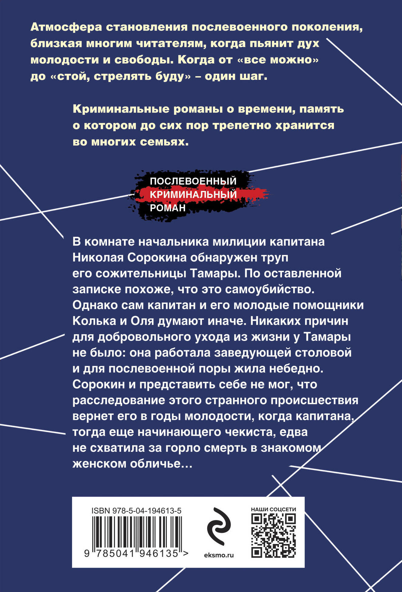В комнате начальника милиции капитана Николая Сорокина обнаружен труп его сожительницы Тамары. По оставленной записке похоже, что это самоубийство. Однако сам капитан и его молодые помощники Колька и Оля думают иначе. Никаких причин для добровольного ухода из жизни у Тамары не было: она работала заведующей столовой и для послевоенной поры жила небедно. Сорокин и представить себе не мог, что расследование этого странного происшествия вернет его в годы молодости, когда капитана, тогда еще начинающего чекиста, едва не схватила за горло смерть в знакомом женском обличье… Атмосфера становления послевоенного поколения, близкая многим читателям, когда пьянит дух молодости и свободы. Когда от «все можно» до «стой, стрелять буду» - один шаг. Криминальные романы о времени, память о котором до сих пор трепетно хранится во многих семьях. Персонажи, похожие на культовые образы фильма «Прощай, шпана замоскворецкая».