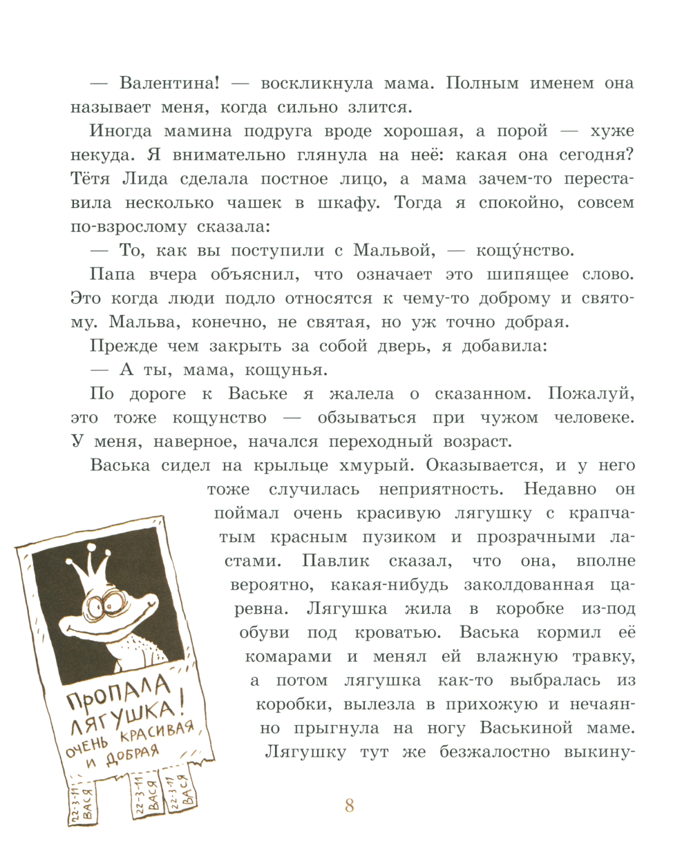 В первой части Валентинка проводит летние каникулы в деревне у бабушки вместе с компаний друзей и собакой Мальвой. За лето столько всего случается! Экспедиция в таинственный Синий лес, встреча с таёжным великаном Сырбырхырчиком, откапывание и закапывание несметных сокровищ, освоение методов дедукции, знакомство с динозавром, который обитает в речке. Эти невероятно весёлые и в какой-то мере драматические приключения достойны того, чтобы главная героиня «Записок…» поделилась ими со своими будущими потомками. Вторая часть записок девочки Валентинки охватывает события её жизни в городе с сентября до следующего лета. Валентинка ходит в школу, пытается прогуливать математику и испытывает ревность к новорождённой сестрёнке. А также заводит новых друзей, ищет ключи от счастья и попробует стать ходячей добродетелью.| Издательство | Настя и Никита |