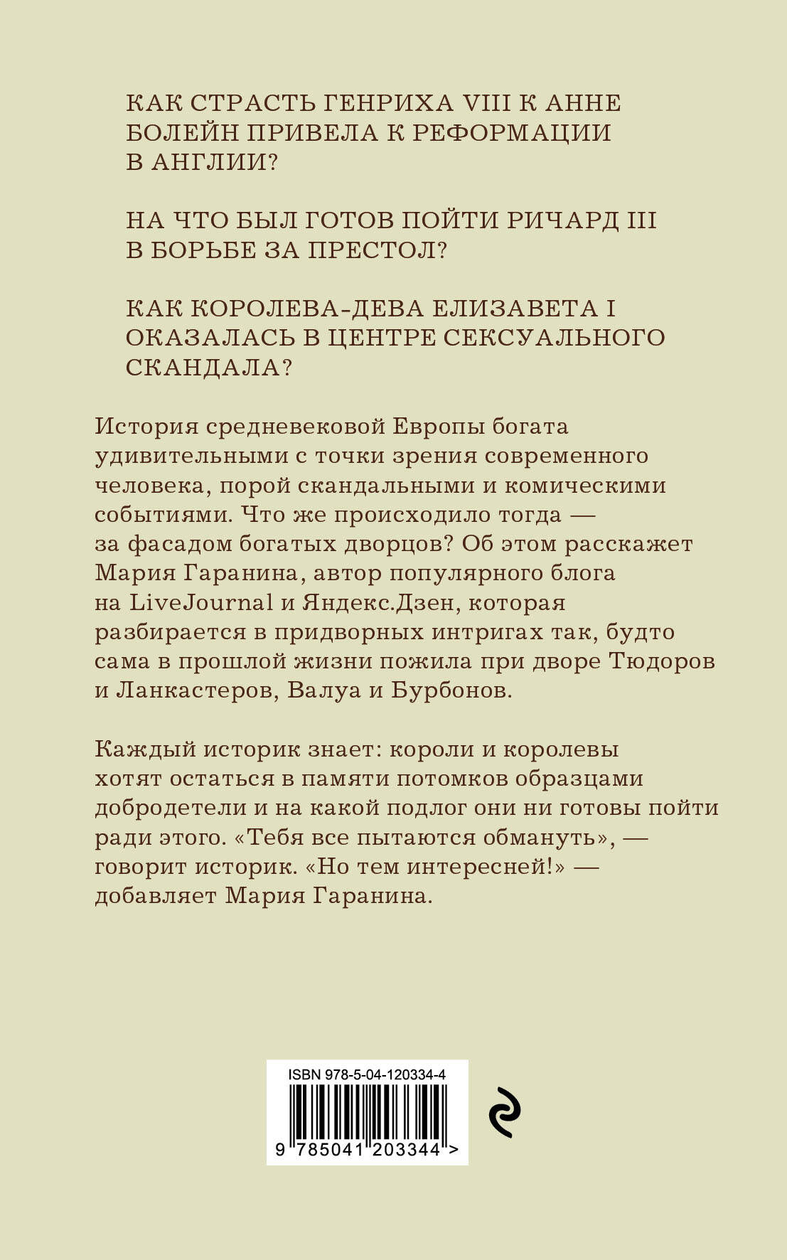 Мария Гаранина, автор книги «Записки исторической сплетницы» и популярного блога на LiveJournal, создала себе интересный образ «сплетницы», который далек от стереотипного представления о светских львицах. Она рассказывает об интригах и казусах из тех времен, когда богатые и властные люди жили во дворцах и никакие нормы общественной морали им были нипочем. Автору удается сохранить интонацию, одновременно очень свойскую и при этом не фамильярную - такой способ изложения истории должен многим прийтись по вкусу. Каждый историк знает: короли и принцессы хотят остаться в памяти потомков образцами добродетели, и на какой подлог они ни готовы пойти ради этого! «Тебя все пытаются обмануть», - говорит себе историк. «Но тем интересней!» - добавляет Мария Гаранина. Без помощи проводника в длинной череде исторических персонажей из Англии, Франции, Шотландии очень просто запутаться. И даже если разберешься, всегда рискуешь заскучать, ведь даже о династических переворотах можно рассказывать занудно, все мы это знаем из уроков истории в школе. Но читателям этой книги скучать точно не придется - события сменяют одно другое, а накал страстей только разгорается.| Издательство | ООО "Издательство "Эксмо" |