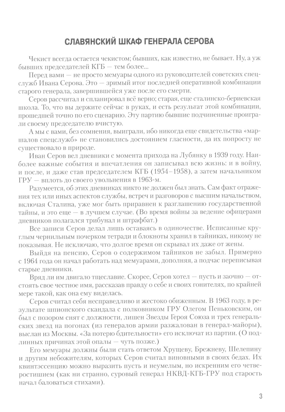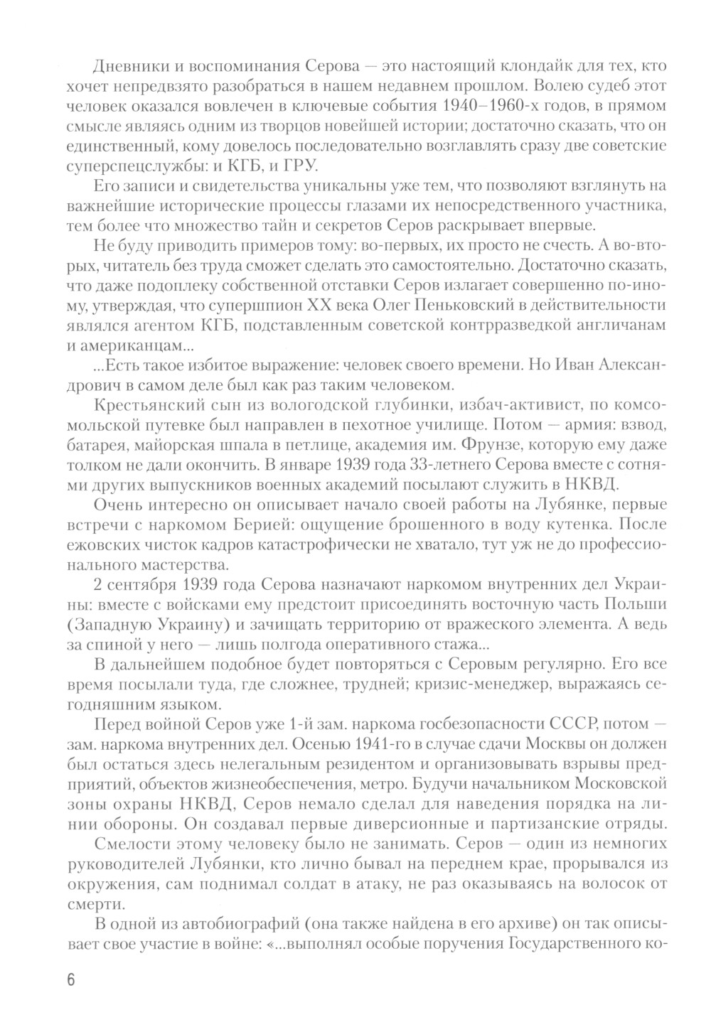 Иван Александрович Серов (1905-1990) - монументальная фигура нашей новейшей истории, один из руководителей НКВД-МВД СССР в 1941-1953 гг., первый председатель КГБ СССР в 1954-1958 гг., начальник ГРУ ГШ в 1958-1963 гг., генерал армии, Герой Советского Союза, едва ли не самый могущественный и информированный человек своего времени. Волею судеб он оказался вовлечен в важнейшие события 1940-1960-х годов, в прямом смысле являясь одним из их творцов. Между тем современные историки рисуют портрет Серова преимущественно мрачными, негативными красками. Его реальные заслуги и успехи почти неизвестны обществу, а в большинстве исследований он предстает узколобым палачом-сталинистом, способным лишь на жестокие расправы. Публикуемые сегодня дневники впервые раскрывают масштаб личности Ивана Серова. Издание снабжено комментариями и примечаниями известного публициста, депутата Госдумы, члена Центрального Совета Российского военно-исторического общества Александра Хинштейна. Уникальность книге добавляют многочисленные фотографии и документы из личного архива И. А. Серова.| Издательство | Просвещение-Союз |
