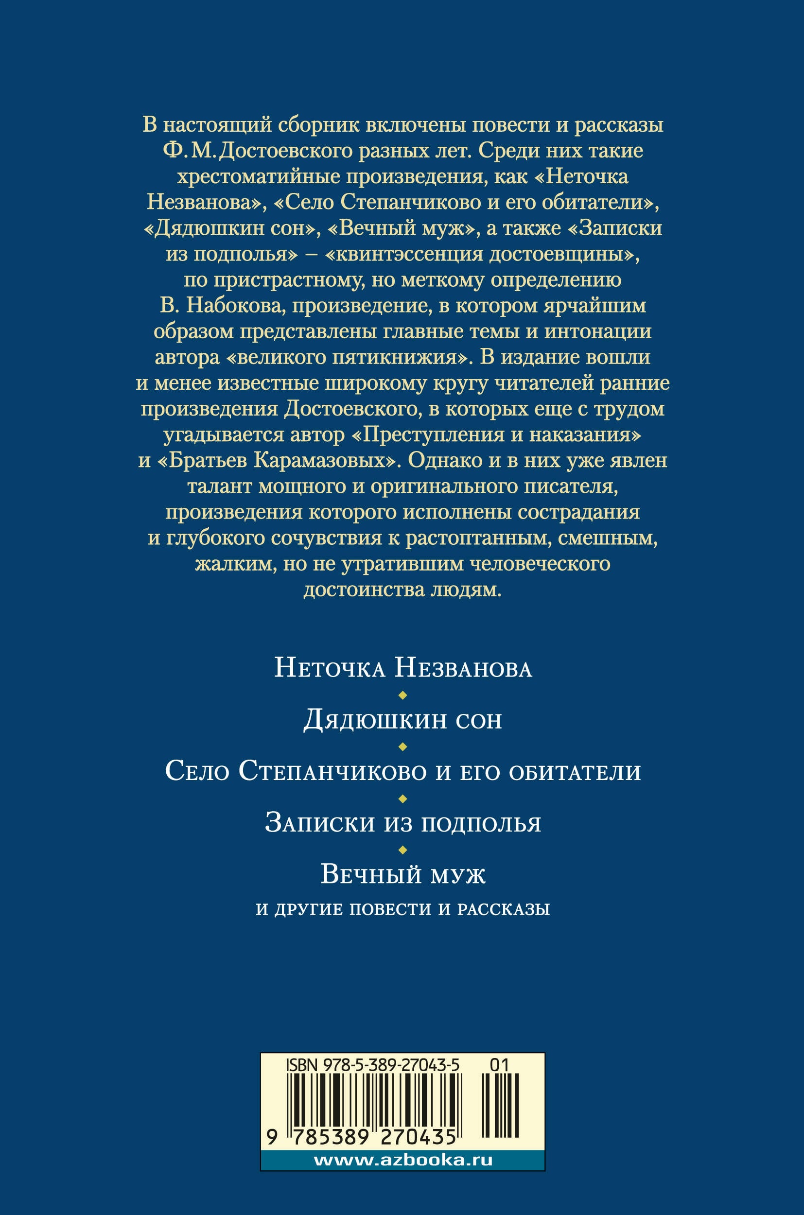 В настоящий сборник включены повести и рассказы Ф. М. Достоевского разных лет. Среди них такие хрестоматийные произведения, как "Неточка Незванова", "Село Степанчиково и его обитатели", "Дядюшкин сон", "Вечный муж", а также "Записки из подполья" - "квинтэссенция достоевщины", по пристрастному, но меткому определению В. Набокова, произведение, в котором ярчайшим образом представлены главные темы и интонации автора "великого пятикнижия". В издание вошли и менее известные широкому кругу читателей ранние произведения Достоевского, в которых еще с трудом угадывается автор "Преступления и наказания" и "Братьев Карамазовых". Однако и в них уже явлен талант мощного и оригинального писателя, произведения которого исполнены сострадания и глубокого сочувствия к растоптанным, смешным, жалким, но не утратившим человеческого достоинства людям.| Издательство | Азбука-Аттикус Издат.группа ООО |
