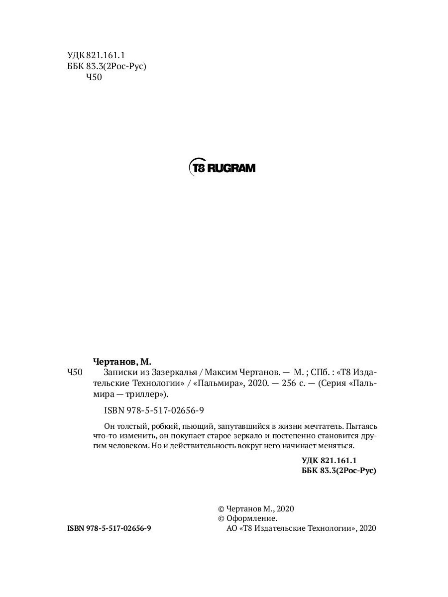 Он толстый, робкий, пьющий, запутавшийся в жизни мечтатель. Пытаясь что-то изменить, он покупает старое зеркало и постепенно становится другим человеком. Но и действительность вокруг него начинает меняться.| Издательство | Т8 RUGRAM |