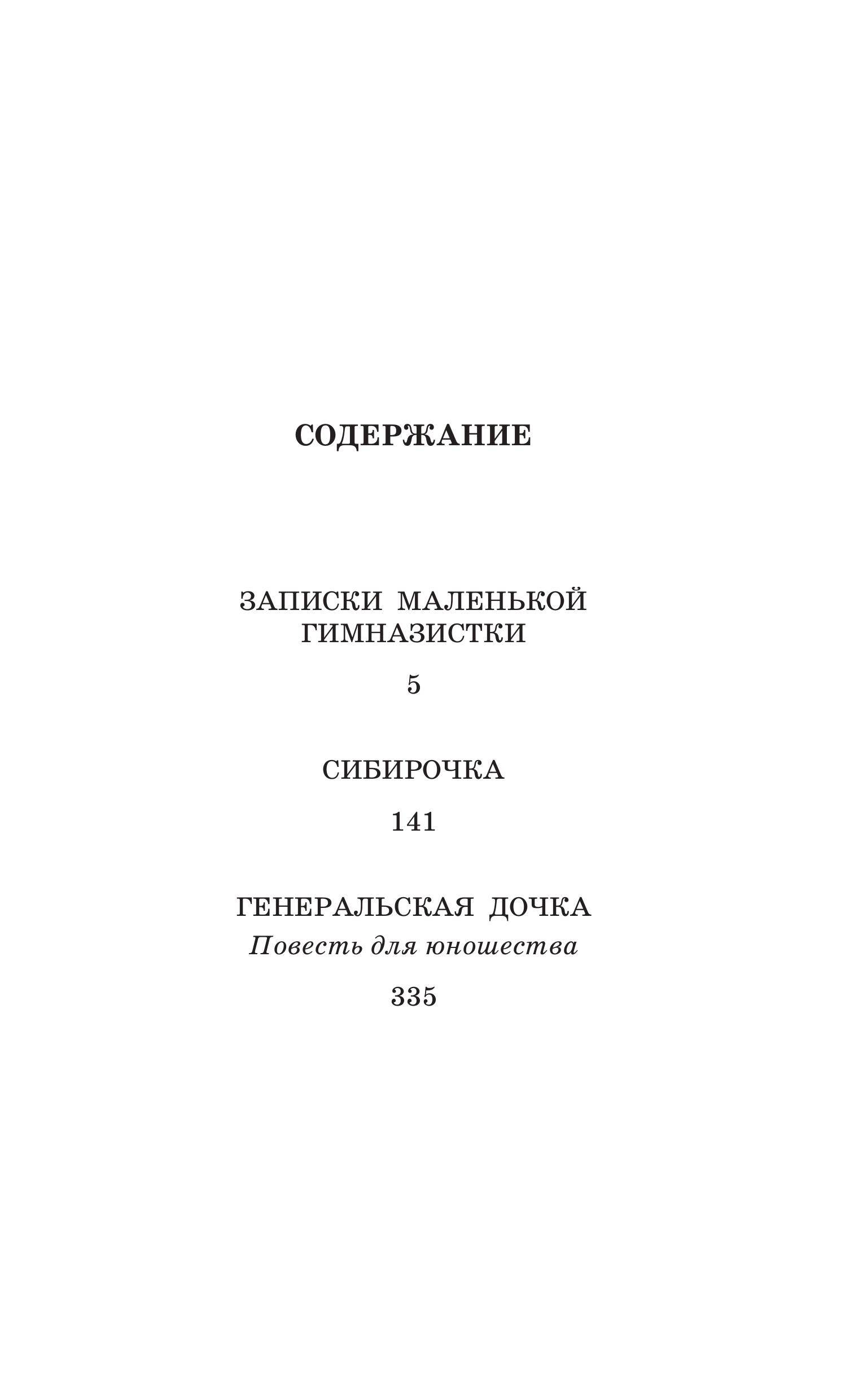 В книгу вошли три повести Лидии Чарской - "Записки маленькой гимназистки", "Сибирочка" и "Генеральская дочка". Героев этих произведений ждет взрослый мир, который не всегда добр и милостив, но в котором можно жить счастливо, если внутри тебя самого есть сострадание, правда и чистая душа. Эта книга поможет юным читателям понять, что из любой ситуации есть выход, что душевные, дружеские отношения важнее внешних качеств и что счастье внутри каждого и им можно и нужно делиться! Для среднего школьного возраста.| Издательство | ИЗДАТЕЛЬСТВО "АСТ" |