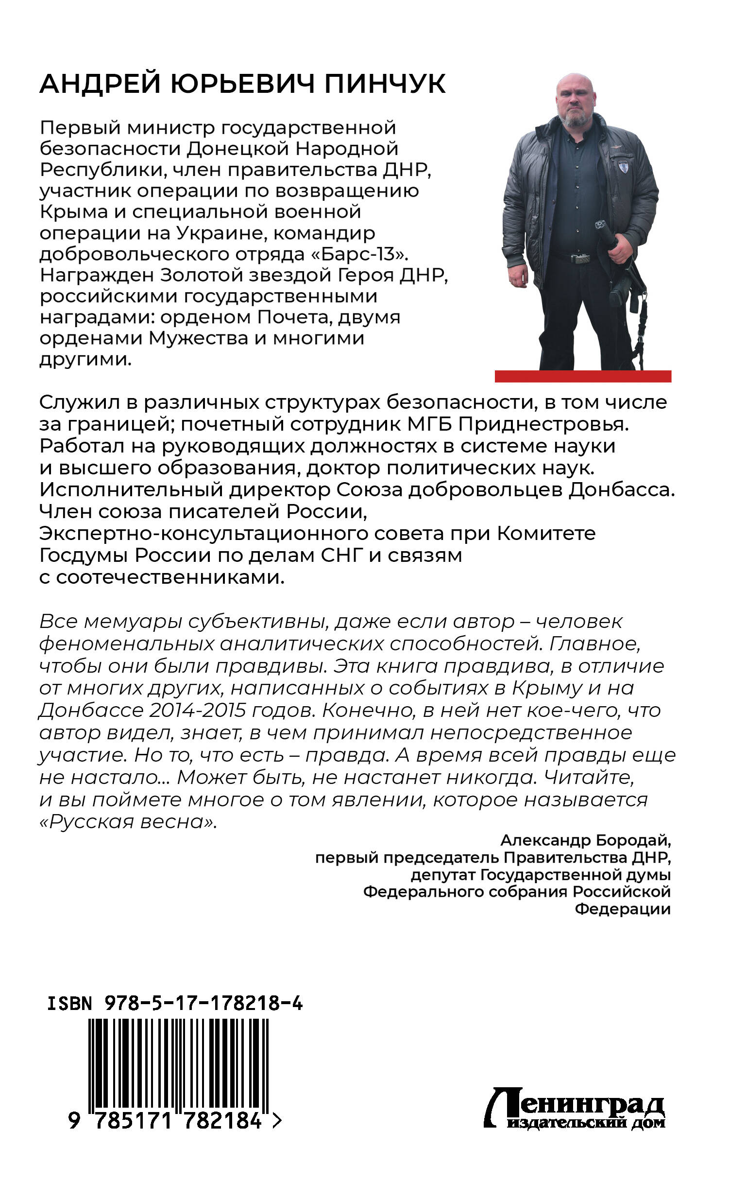История полковника Андрея Юрьевича Пинчука невероятна по своему накалу и уровню сопричастности к важнейшим событиям современной России. Много лет он находился на острие российских интересов, проводил специальные операции на территории СНГ; участвовал в защите Приднестровья, Абхазии; организовал взятие под контроль украинских спецслужб в Крыму накануне референдума; встал одним из первых на защиту Донбасса, где он в июле 2014 года создал Министерство государственной безопасности ДНР, которым и руководил вплоть до заключения вторых Минских соглашений. Во многом благодаря этому молодая республика выстояла. В книге автор делится неизвестными подробностями первых шагов становления ДНР, раскрывая роли участников, детали и изнанку событий. Делает он это с несвойственной спецслужбам откровенностью, что превращает книгу в не имеющий аналогов источник знаний о хитросплетениях современных политических процессов, противоборстве спецслужб и этапах военного противостояния. После начала СВО Андрей Пинчук стал одним из учредителей Союза добровольцев Донбасса и командиром добровольческого отряда "Барс-13".| Издательство | Издательство "АСТ" |