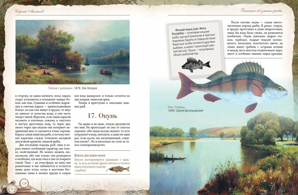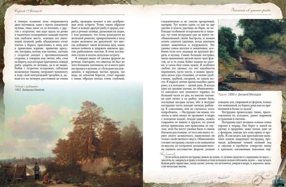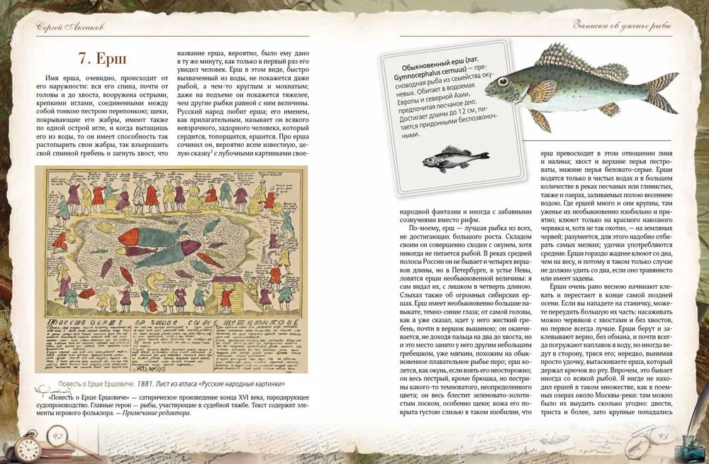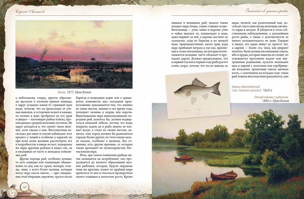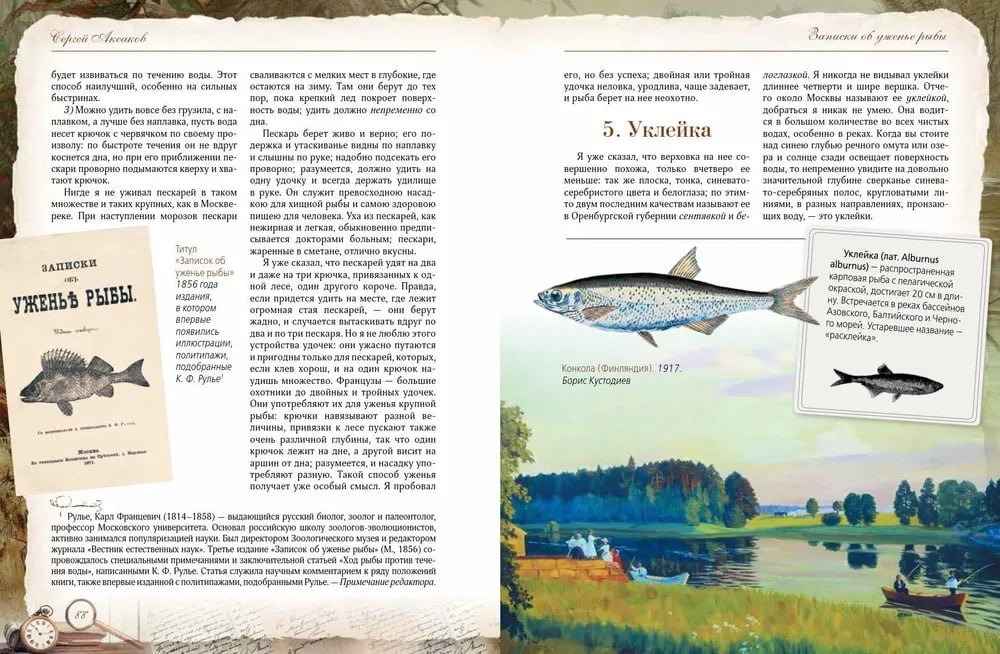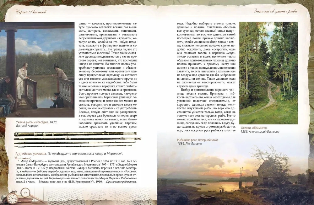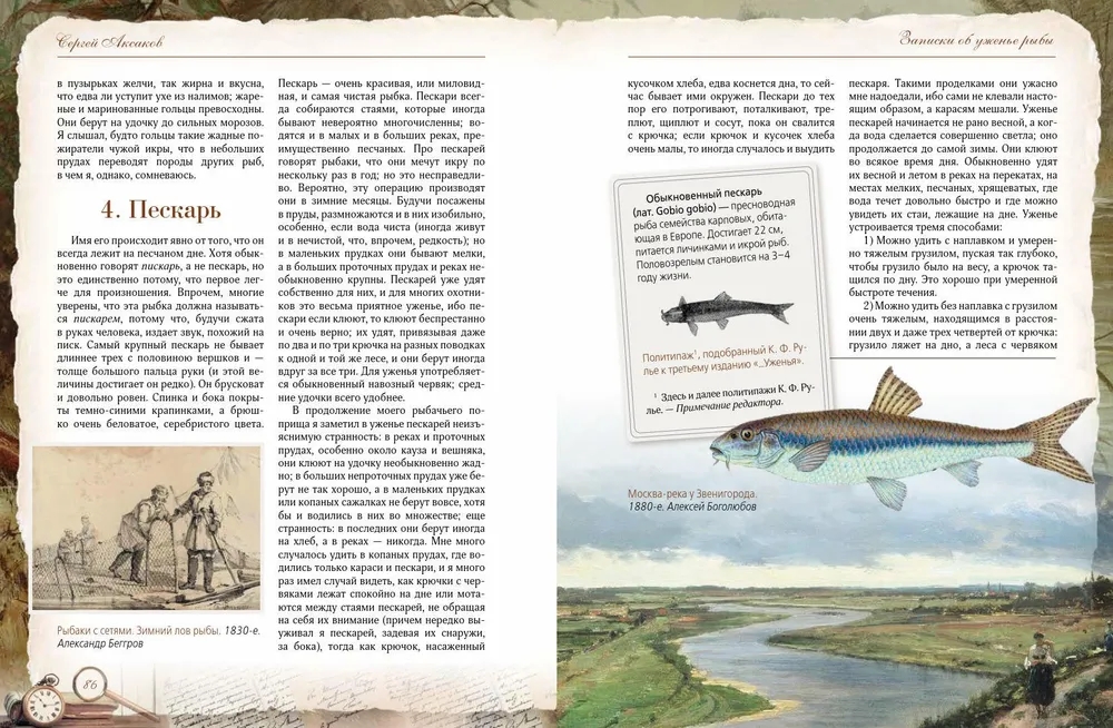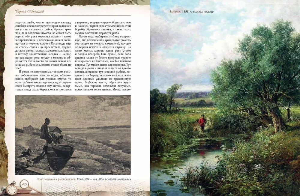 Сергей Тимофеевич Аксаков (1791-1859) - знаменитый русский писатель, знаток природы, автор классических произведений, посвященных охоте и рыбалке. Его книга «Записки об уженье рыбы» - не просто практическое руководство для рыболовов, но и настоящая поэма о русской природе, погружающая читателя в атмосферу жизни середины XIX века. «Записки об уженье рыбы» Сергея Аксакова одновременно являются классическим руководством по рыбной ловле и художественным произведением, воспевающим красоту русской природы и особенности старинного рыболовства. Аксаков детально описывает повадки рыб, методы ловли и устройство снастей, делая это с мастерством наблюдателя и философа. Уникальность этой книги заключается в гармоничном сочетании практической пользы и художественных зарисовок, которые вдохновляют и очаровывают. Издание богато иллюстрировано литографиями, гравюрами XIX века и изображениями рыболовных снастей того времени. Оно представляет собой самую полную галерею русской живописи в «рыболовном жанре», что делает книгу не только полезным справочником, но и прекрасным подарком для всех, кто увлечен рыбалкой.