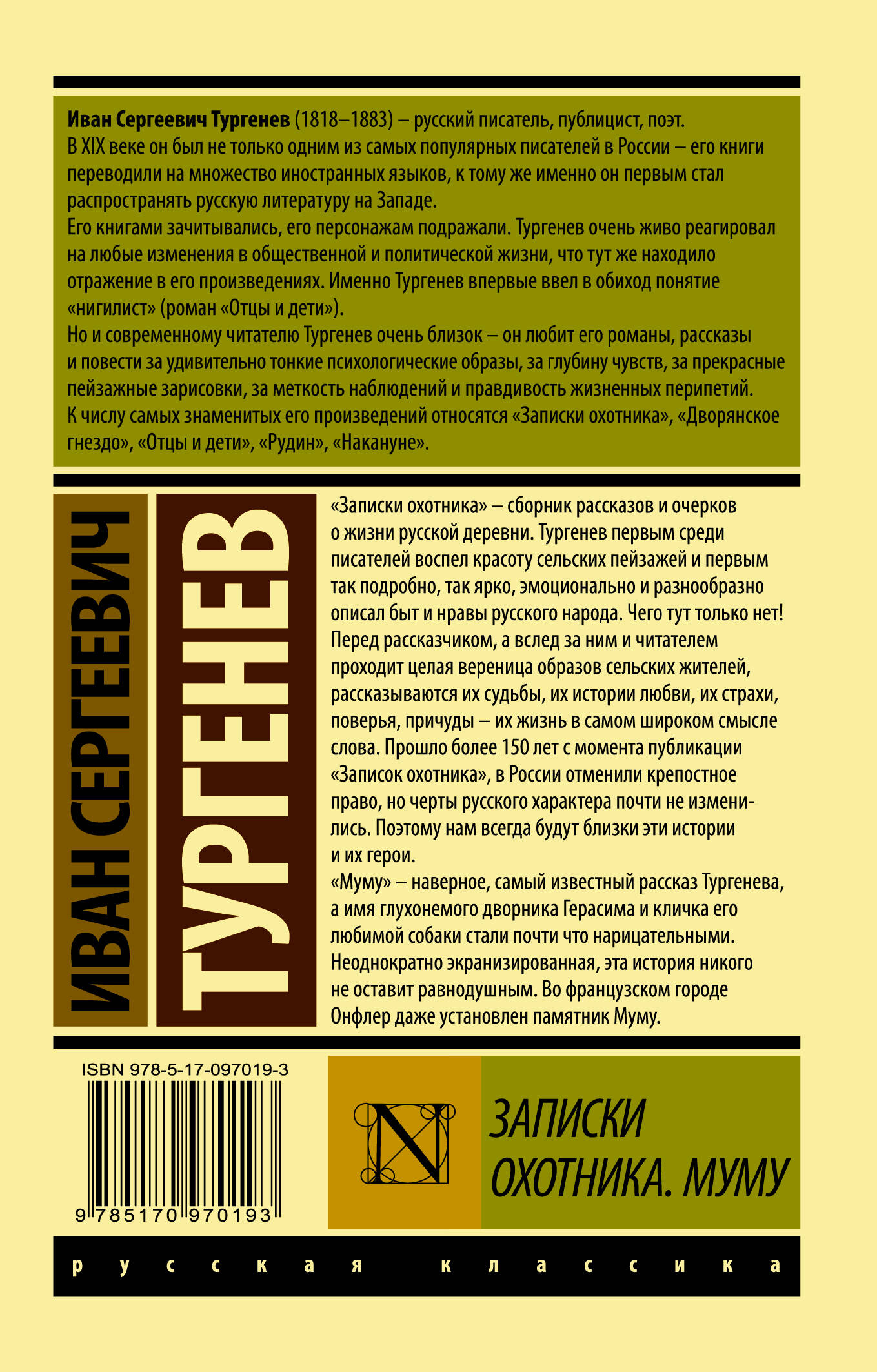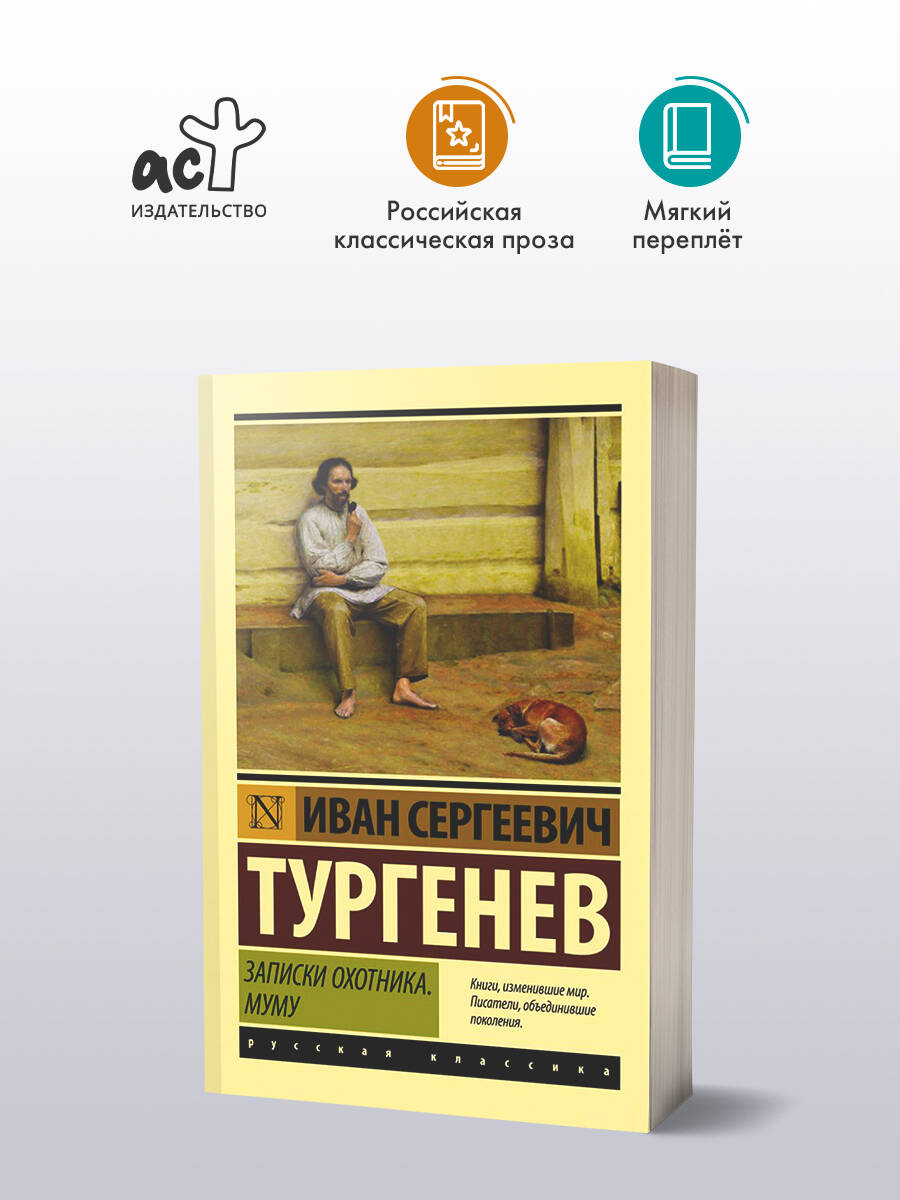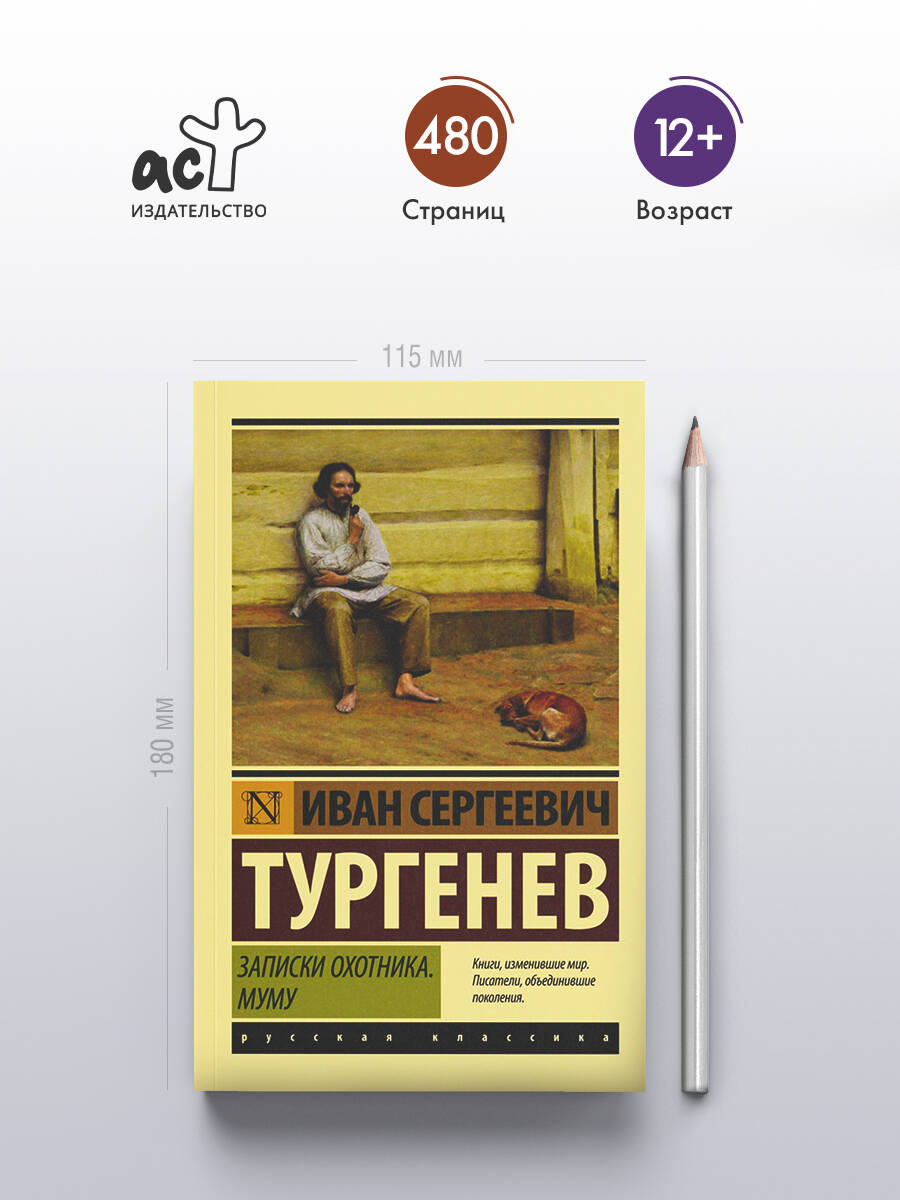 "Записки охотника" - сборник рассказов и очерков о жизни русской деревни. Тургенев первым среди писателей воспел красоту сельских пейзажей и первым так подробно, так ярко, эмоционально и разнообразно описал быт и нравы русского народа. Чего тут только нет! Перед рассказчиком, а вслед за ним и читателем проходит целая вереница образов сельских жителей, рассказываются их судьбы, их истории любви, их страхи, поверья, причуды - их жизнь в самом широком смысле слова. Прошло более 150 лет с момента публикации "Записок охотника", в России отменили крепостное право, но черты русского характера почти не изменились. Поэтому нам всегда будут близки эти истории и их герои. "Муму" - наверное, самый известный рассказ Тургенева, а имя глухонемого дворника Герасима и кличка его любимой собаки стали почти что нарицательными. Неоднократно экранизированная, эта история никого не оставит равнодушным. Во французском городе Онфлер даже установлен памятник Муму.| Издательство | ИЗДАТЕЛЬСТВО "АСТ" |