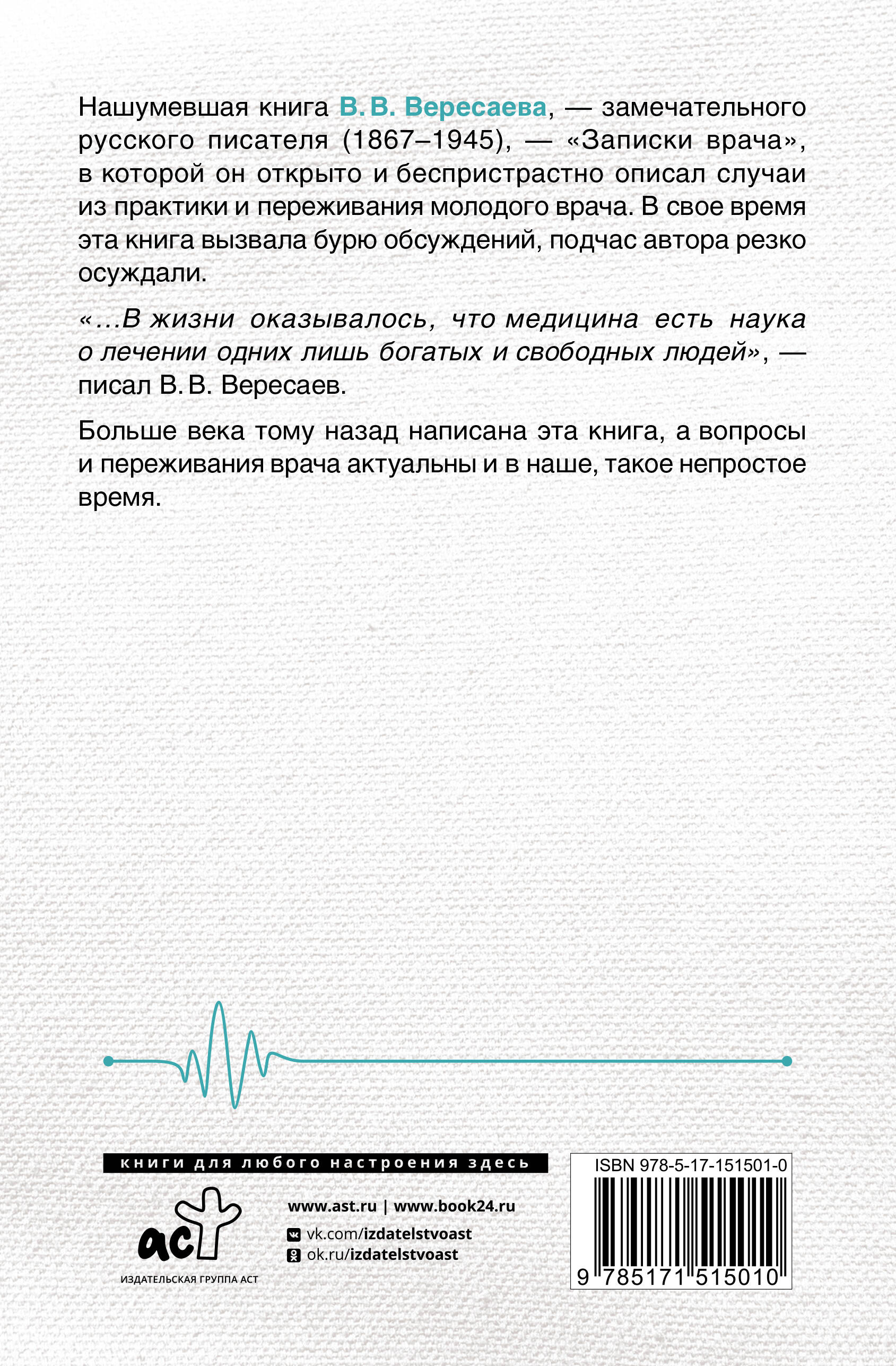 Нашумевшая книга В. В. Вересаева - замечательного русского писателя (1867-1945) - "Записки врача", в которой он открыто и беспристрастно описал случаи из практики и переживания молодого врача. В свое время эта книга вызвала бурю обсуждений. И не удивительно. Первые шаги свежеиспеченного специалиста начинающего свой путь на медицинском поприще. Удачи и неудачи. Страх ошибки, которая может погубить ни в чем неповинного пациента. Стрессы. Отчаяние. Опасные и морально сомнительные, но необходимые эксперименты на людях, в поисках новых методов лечения. Сенсация и скандал - появление врачей-женщин. Что же она все-таки такое, эта жизнь молодого, начинающего врача? "…В жизни оказывалось, что медицина есть наука о лечении одних лишь богатых и свободных людей", - писал В. В. Вересаев. Больше века тому назад написана эта книга, а вопросы и переживания врача актуальны и в наше такое не простое время.| Издательство | ИЗДАТЕЛЬСТВО "АСТ" |