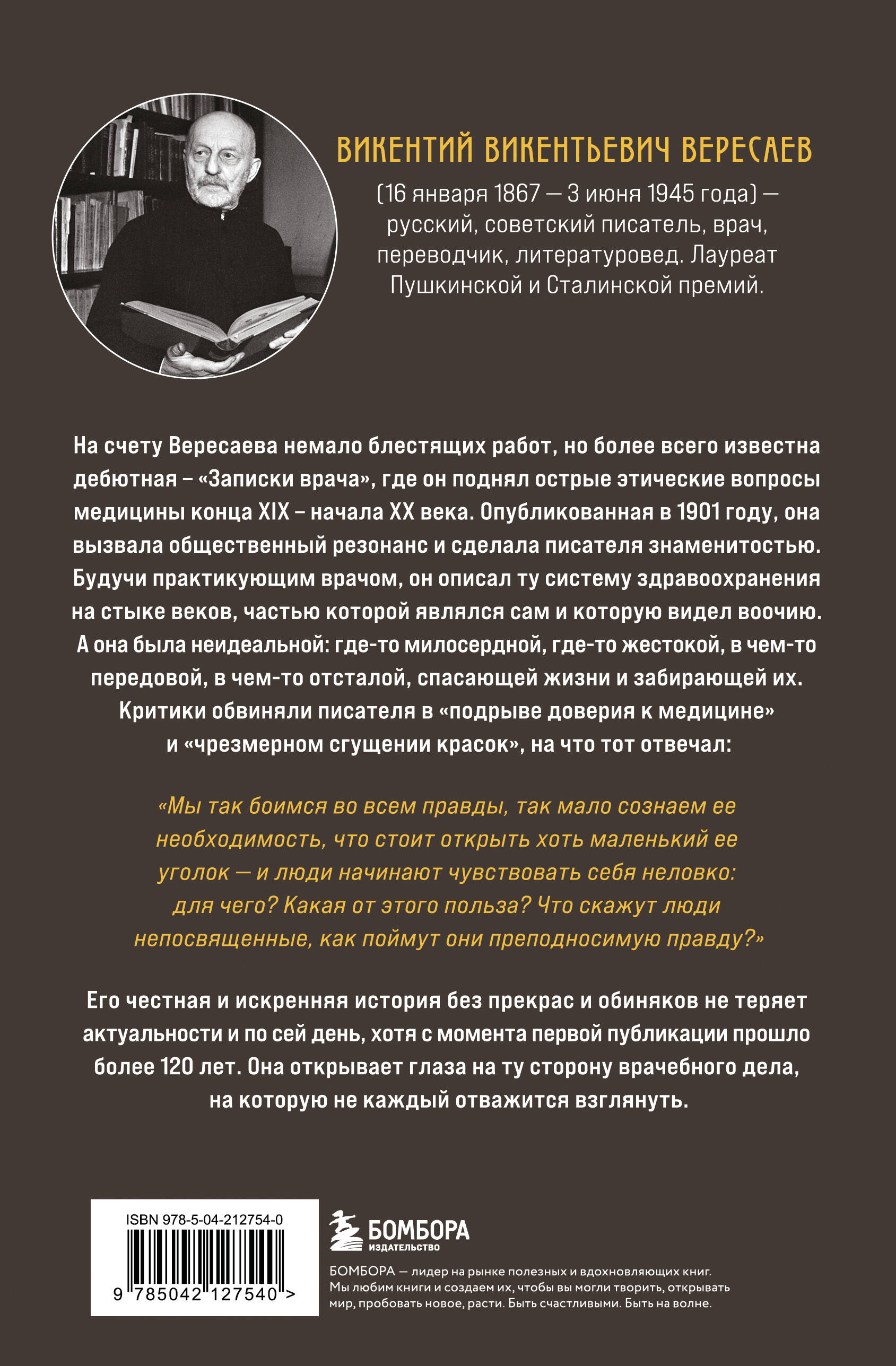 «Я - обыкновеннейший средний врач, со средним умом и средними знаниями; я сам путаюсь в противоречиях, я решительно не в силах разрешить многие из тех тяжелых, настоятельно требующих решения вопросов, которые возникают предо мною на каждом шагу. Единственное мое преимущество, - что я еще не успел стать человеком профессии и что для меня еще ярки и сильны те впечатления, к которым со временем невольно привыкаешь». Эти слова принадлежат выдающемуся русскому литератору, писателю, переводчику и врачу - Викентию Вересаеву. Его литературный дебют «Записки врача» начинается с «признания» в собственном несовершенстве, и в этом вся прелесть этой книги. Она полна признаний в бессилии и надежд на успех, описаний врачебных ошибок и чудесных спасений. Автор рассуждает о том, что нужно врачу для того, чтобы вести успешную практику, как пережить неизбежные фатальные ошибки, совершенные вследствие нехватки опыта или несовершенства средств диагностики того времени, говорит о незавидном положении простых людей, не имеющих средств на оплату платного приема и становящихся «пособием» для студентов медицинских институтов. Все это делает «Записки врача» уникально честной летописью врачебного дела в России конца XIX 一 начала XX века.| Издательство | ООО "Издательство "Эксмо" |