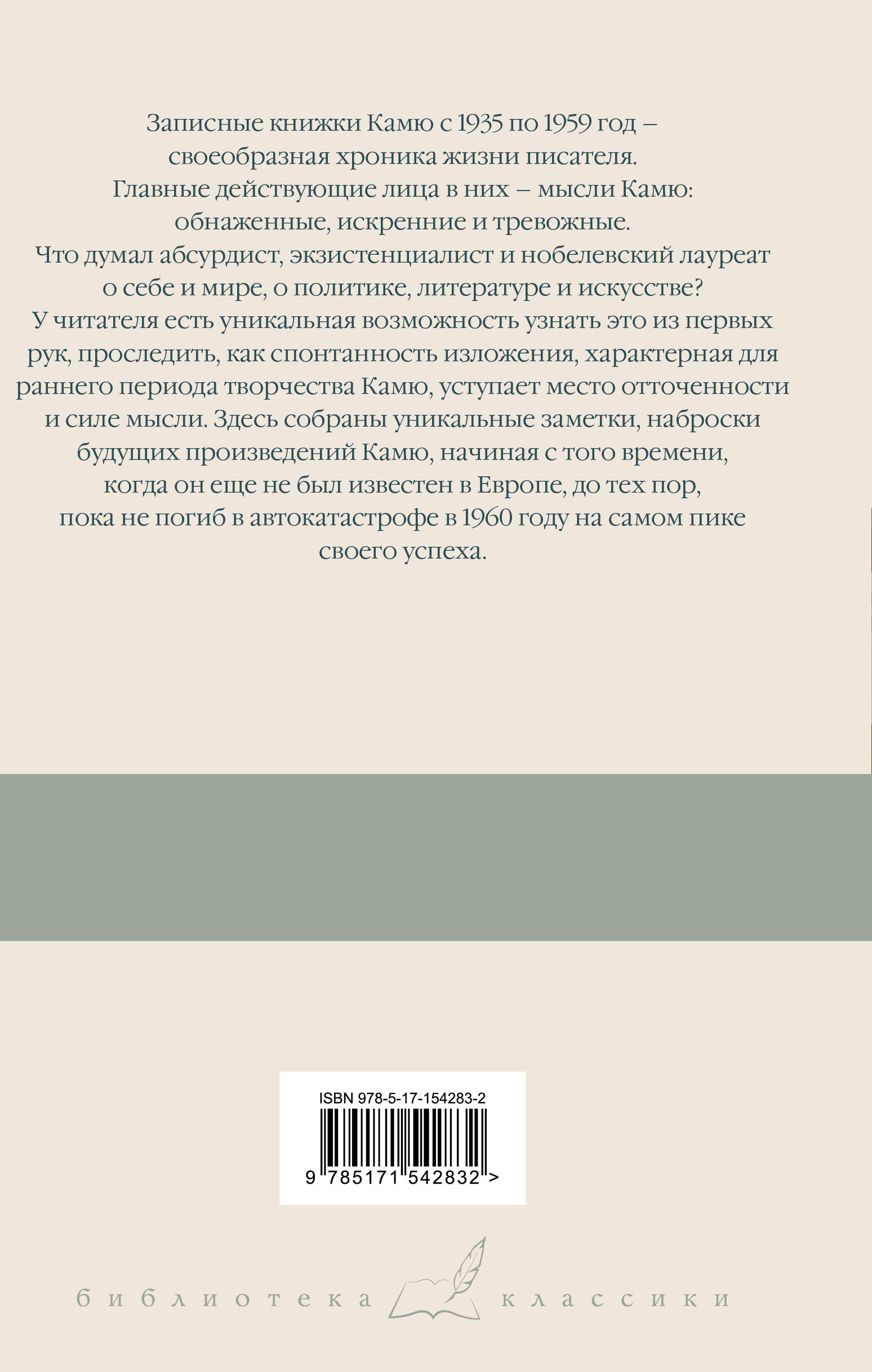 Записные книжки Камю с 1935 по 1959 год - своеобразная хроника жизни писателя. Главные действующие лица в них - мысли Камю: обнаженные, искренние и тревожные. Что думал абсурдист, экзистенциалист и нобелевский лауреат о себе и мире, о политике, литературе и искусстве? У читателя есть уникальная возможность узнать это из первых рук, проследить, как спонтанность изложения, характерная для раннего периода творчества Камю, уступает место отточенности и силе мысли. Здесь собраны уникальные заметки, наброски будущих произведений Камю, начиная с того времени, когда он еще не был известен в Европе, до тех пор, пока не погиб в автокатастрофе в 1960 году на самом пике своего успеха.| Издательство | ИЗДАТЕЛЬСТВО "АСТ" |