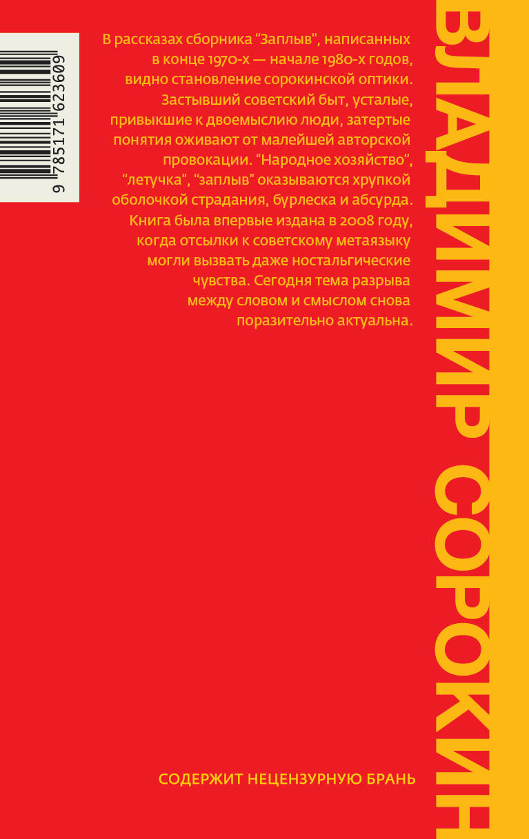 В рассказах сборника "Заплыв", написанных в конце 1970‑х - начале 1980‑х годов, видно становление сорокинской оптики. Застывший советский быт, усталые, привыкшие к двоемыслию люди, затертые понятия оживают от малейшей авторской провокации. "Народное хозяйство", "летучка", "заплыв" оказываются хрупкой оболочкой страдания, бурлеска и абсурда. Тексты сборника очень разные - в одних непривычна рефлексия от первого лица ("Ватник"), в других - лаконичность жанра ("Стихи и песни", вошедшие в роман "Норма"); третьи же - опыты исследования человеческой природы на просторах тоталитарного государства в духе зрелого Сорокина ("Розовый клубень", "Дача", "Падёж"). Книга была впервые издана в 2008 году, когда отсылки к советскому метаязыку могли читаться даже с ностальгическим чувством. Сегодня тема разрыва между словом и смыслом снова поразительно актуальна.| Издательство | Издательство "АСТ" |