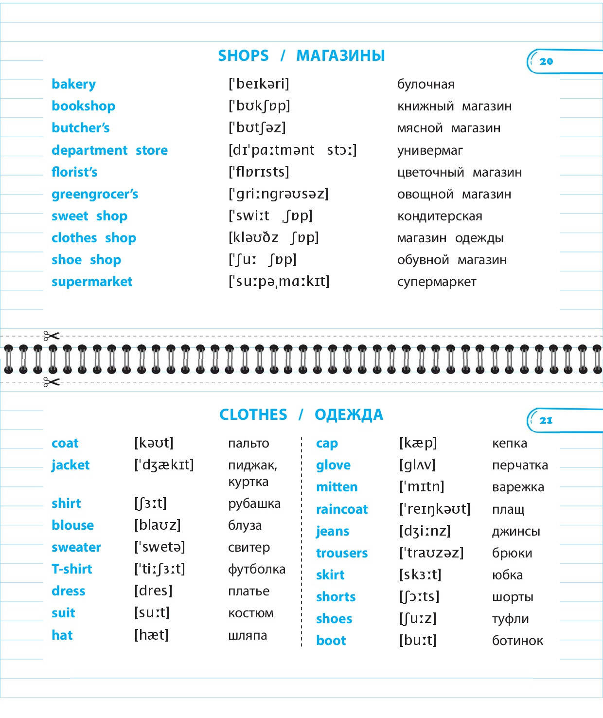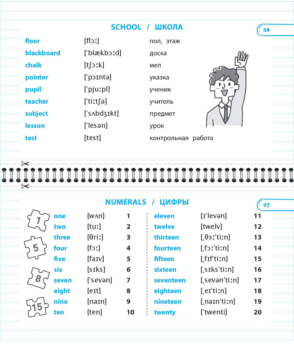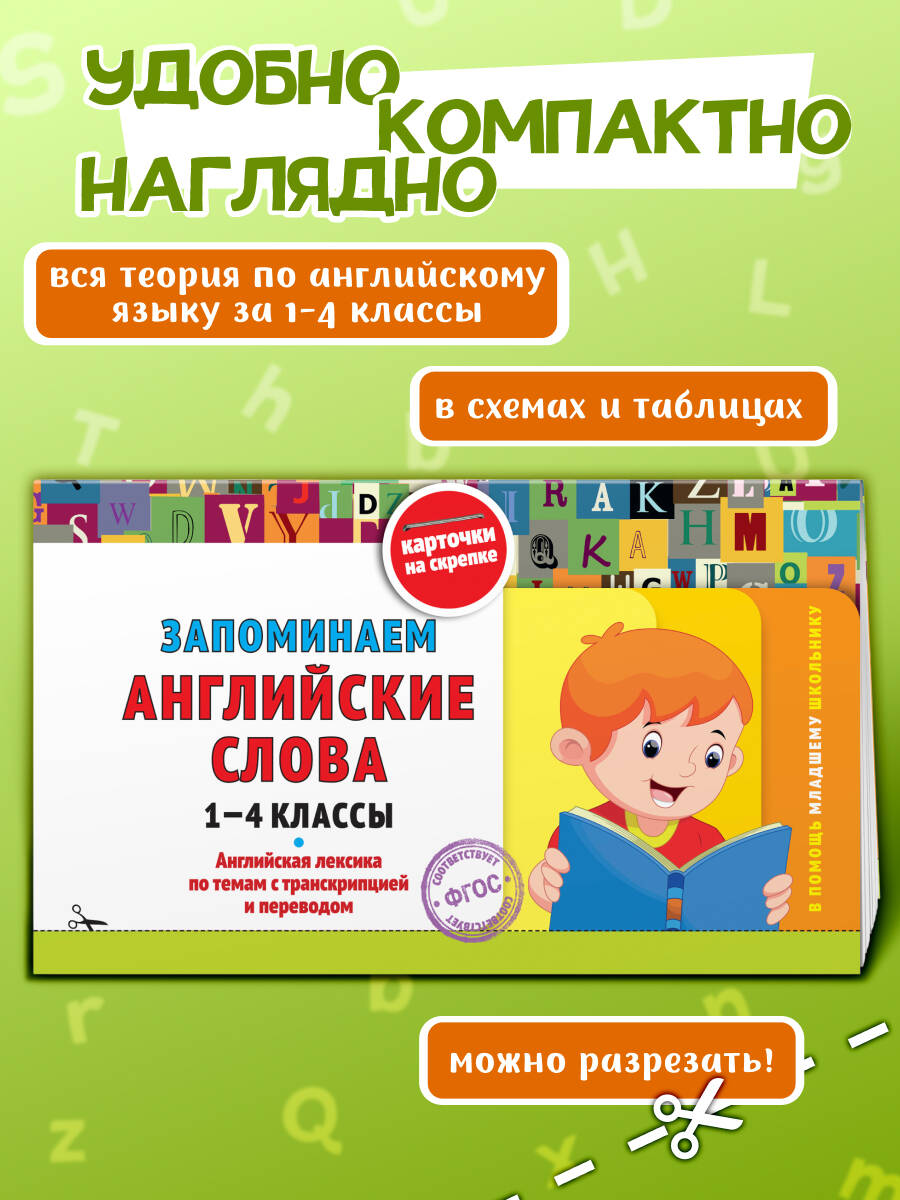 Карточки на скрепке способствуют закреплению знаний, полученных в школе. В пособие включены слова, которые обязательно должны входить в активный словарь младшего школьника, изучающего английский язык. Примеры и иллюстрации помогут ученику быстрее и надежнее запоминать слова. Каждую страницу можно вырезать по пунктирной линии и использовать как карточку, с помощью которой можно будет быстрее и надёжнее усвоить основные правила. Современное и удобное в использовании пособие соответствует требованиям ФГОС начального общего образования.| Издательство | ООО "Издательство "Эксмо" |