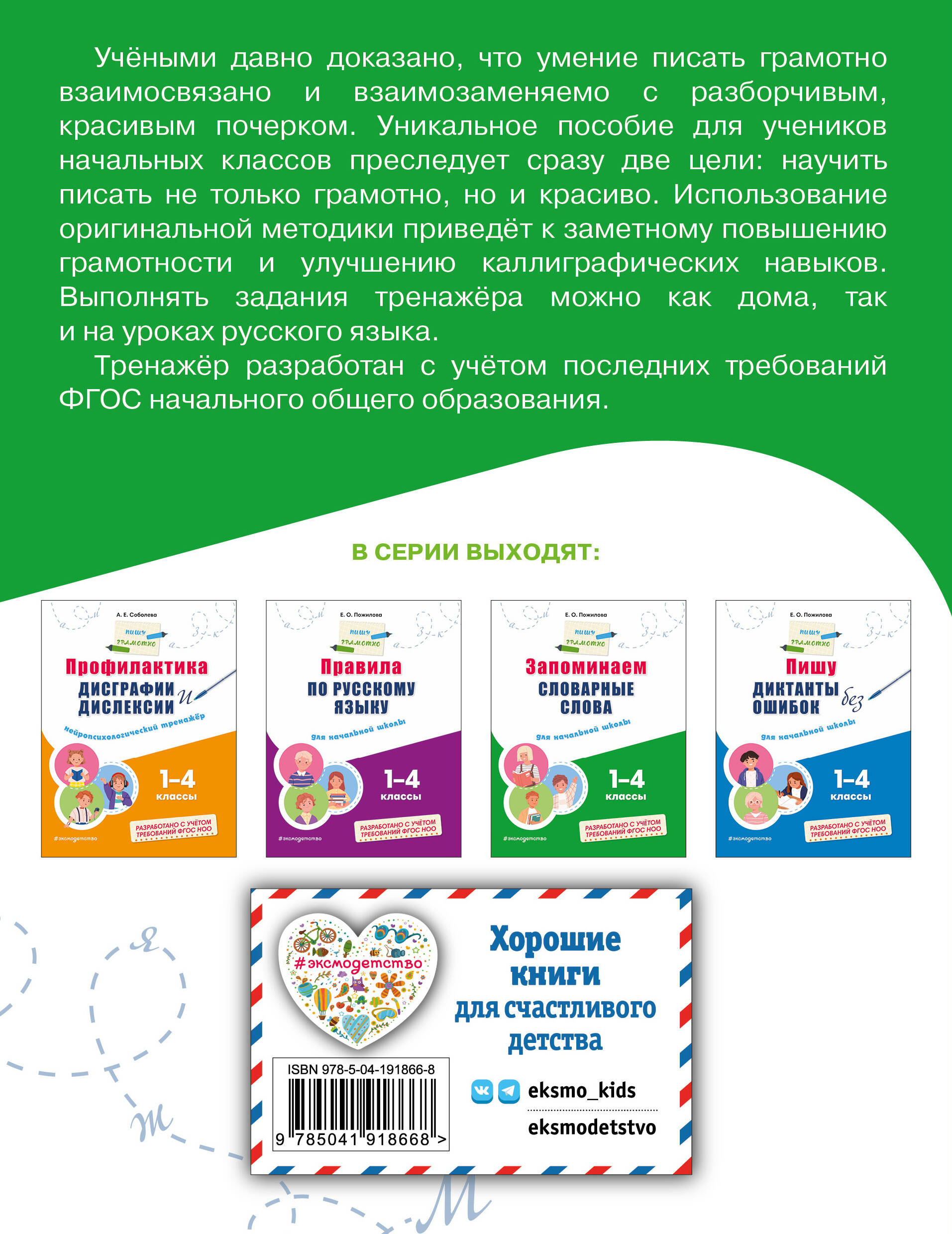 Тренажёр помогает решить важнейшую задачу, стоящую перед учениками начальной школы - запомнить все словарные слова, изучаемые в 1-4 классах. Задания данного пособия помогут детям систематизировать знания, полученные на уроках русского языка, и развить свою речевую культуру. Тренажёр можно использовать как дома для совместной работы учеников и взрослых, так и в школе в качестве дополнительного материала. Пособие разработано в соответствии с требованиями ФГОС начального общего образования.| Издательство | ООО "Издательство "Эксмо" |