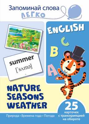 В «английский» комплект «Природа, времена года, погода» входят 25 тематических карточек. На лицевой стороне каждой карточки представлен цветной рисунок, на обратной - написание слова на английском языке, транскрипция и уровень сложности. Слова разделены на 4 уровня сложности, каждый из них обозначен римской цифрой.