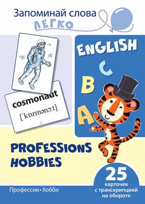 В «английский» комплект «Профессии, хобби» входят 25 тематических карточек. На лицевой стороне каждой карточки представлен цветной рисунок, на обратной - написание слова на английском языке, транскрипция и уровень сложности. Слова разделены на 4 уровня сложности, каждый из них обозначен римской цифрой.