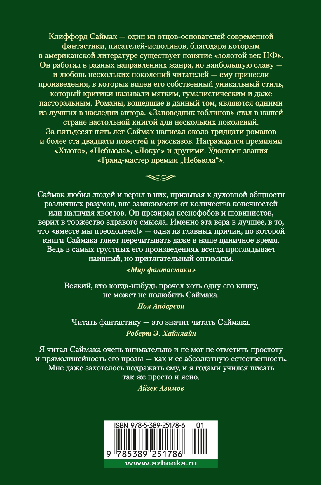 Клиффорд Саймак - один из отцов-основателей современной фантастики, писателей-исполинов, благодаря которым в американской литературе существует понятие «золотой век НФ». Он работал в разных направлениях жанра, но наибольшую славу - и любовь нескольких поколений читателей - ему принесли произведения, в которых виден его собственный уникальный стиль, который критики называли мягким, гуманистическим и даже пасторальным. Романы, вошедшие в данный том, являются одними из лучших в наследии автора. «Заповедник гоблинов» стал в нашей стране настольной книгой для нескольких поколений. За пятьдесят пять лет Саймак написал около тридцати романов и более ста двадцати повестей и рассказов. Награждался премиями «Хьюго», «Небьюла», «Локус» и другими. Удостоен звания «Гранд-мастер премии "Небьюла"».| Издательство | Азбука |