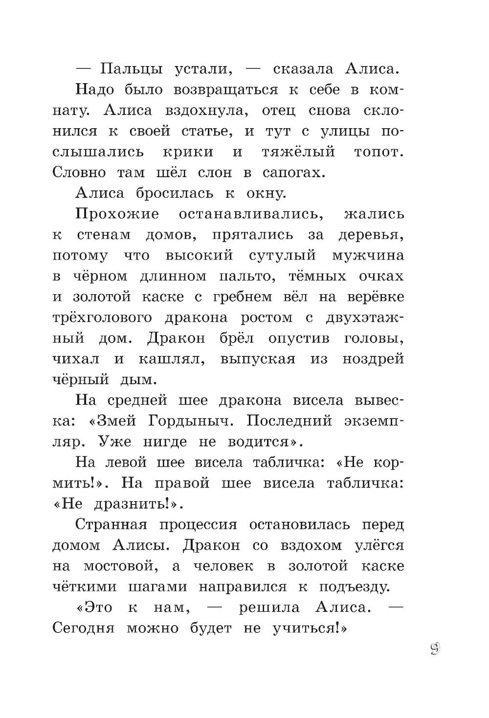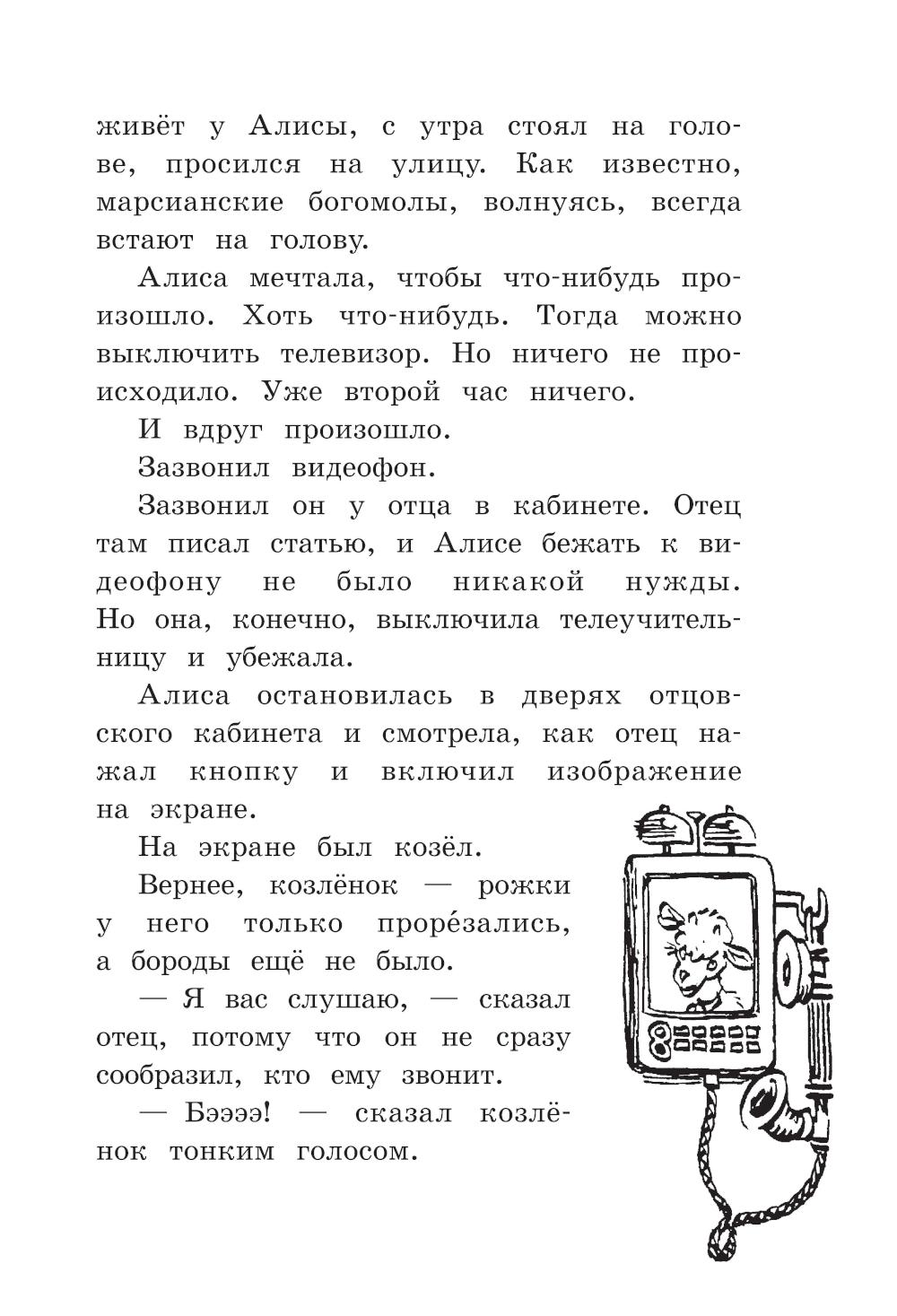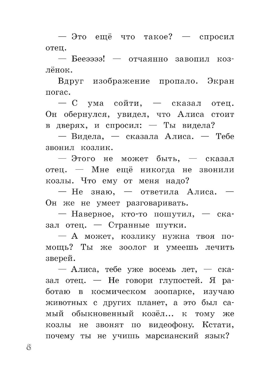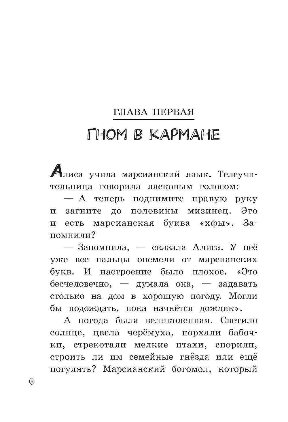 В этой повести Алисе Селезневой восемь лет, она активно изучает марсианский язык... и неожиданно попадает в заповедник сказок, директор которого неизвестно куда исчез. Местные жители, экспонаты, полагают, что он стал жертвой зловещего заговора. Вместе с Дедом Морозом, Змеем Гордынычем и другими сказочными героями Алиса непременно разоблачит негодяев.| Издательство | Изд. Лабиринт Пресс |