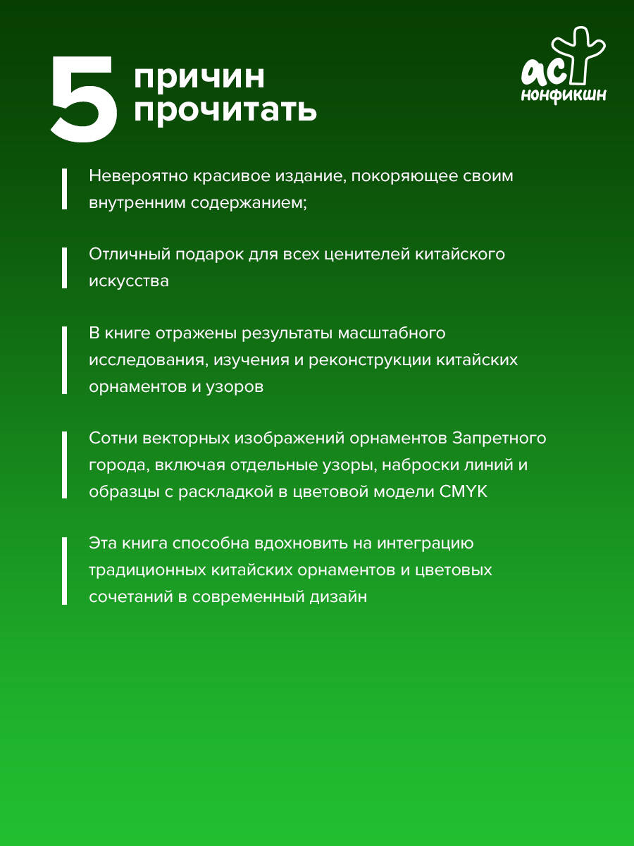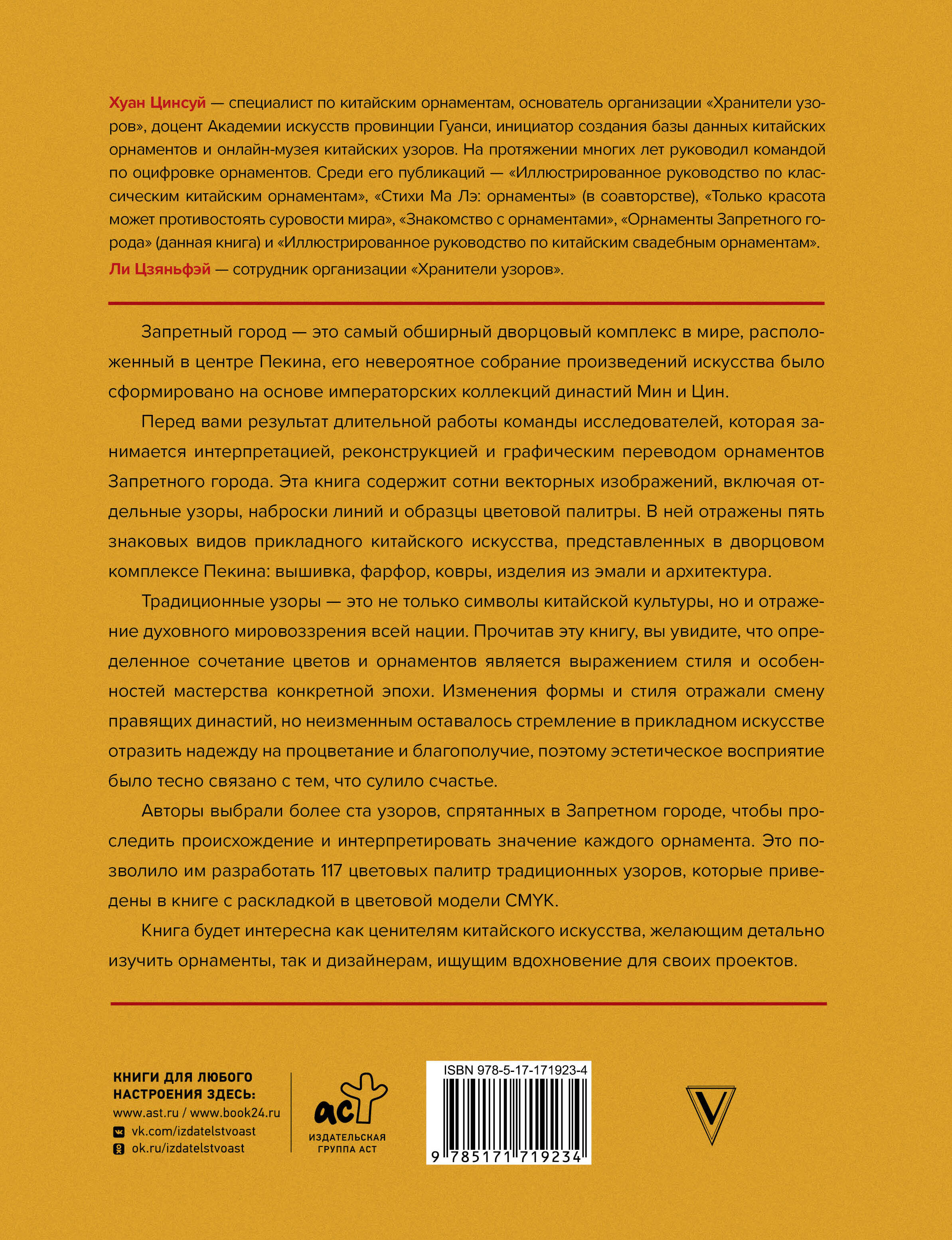 Хуан Цинсуй - специалист по китайским орнаментам, основатель организации "Хранители узоров", доцент Академии искусств провинции Гуанси, инициатор создания базы данных китайских орнаментов и онлайн-музея китайских узоров. Ли Цзяньфэй - сотрудник организации "Хранители узоров". Запретный город - это самый обширный дворцовый комплекс в мире, расположенный в центре Пекина, его невероятное собрание произведений искусства было сформировано на основе императорских коллекций династий Мин и Цин. Перед вами результат длительной работы команды исследователей, которая занимается интерпретацией, реконструкцией и графическим переводом орнаментов Запретного города. Эта книга содержит сотни векторных изображений, включая отдельные узоры, наброски линий и образцы цветовой палитры. В ней отражены пять знаковых видов прикладного китайского искусства, представленных в дворцовом комплексе Пекина: вышивка, фарфор, ковры, изделия из эмали и архитектура. Традиционные узоры - это не только символы китайской культуры, но и отражение духовного мировоззрения всей нации. Прочитав эту книгу, вы увидите, что определенное сочетание цветов и орнаментов является выражением стиля и особенностей мастерства конкретной эпохи. Изменения формы и стиля отражали смену правящих династий, но неизменным оставалось стремление в прикладном искусстве отразить надежду на процветание и благополучие, поэтому эстетическое восприятие было тесно связано с тем, что сулило счастье. Авторы выбрали более ста узоров, спрятанных в Запретном городе, чтобы проследить их происхождение и интерпретировать значение каждого орнамента. Это позволило им разработать 117 цветовых палитр традиционных узоров, которые приведены в книге с раскладкой в цветовой модели CMYK. Книга будет интересна как ценителям китайского искусства, желающим детально изучить орнаменты, так и дизайнерам, ищущим вдохновение для своих проектов.| Издательство | Издательство "АСТ" |
