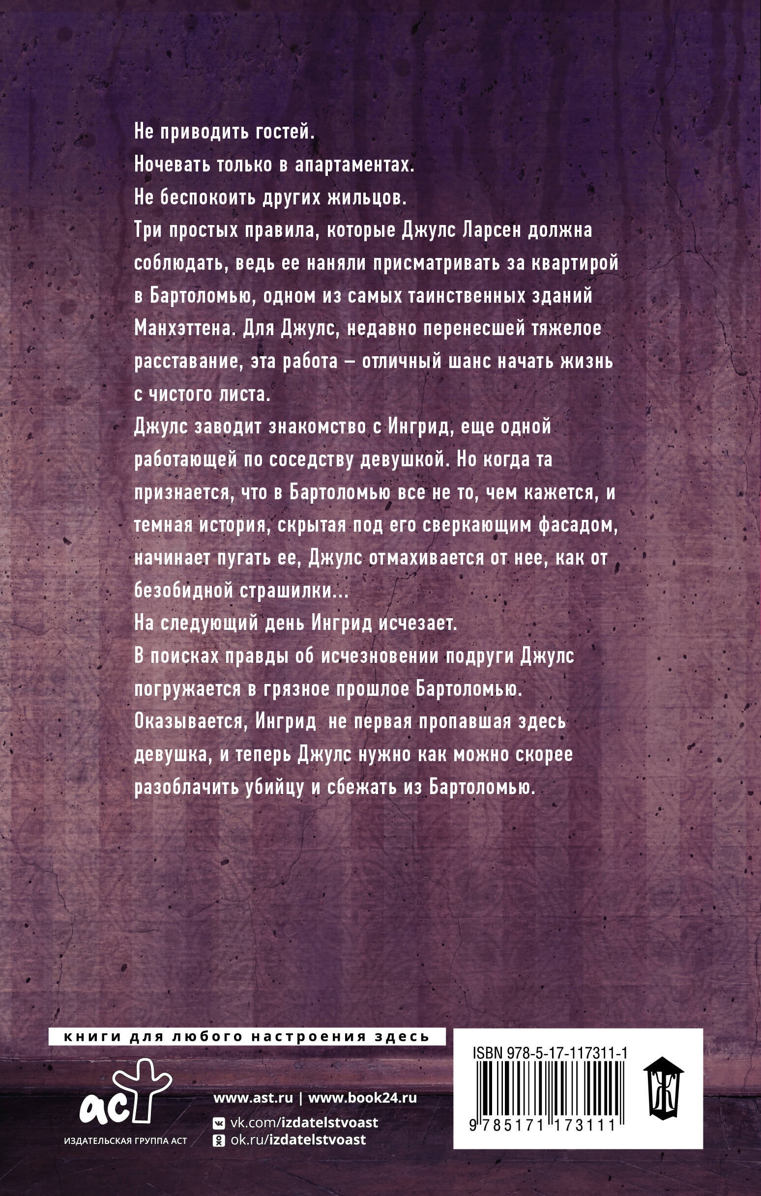 Не приводить гостей. Ночевать только в апартаментах. Не беспокоить других жильцов. Три простых правила, которые Джулс Ларсен должна соблюдать, ведь ее наняли присматривать за квартирой в Бартоломью, одном из самых таинственных зданий Манхэттена. Для Джулс, недавно перенесшей тяжелое расставание, эта работа - отличный шанс начать жизнь с чистого листа. Джулс заводит знакомство с Ингрид, еще одной работающей по соседству девушкой. Но когда та признается, что в Бартоломью все не то, чем кажется, и темная история, скрытая под его сверкающим фасадом, начинает пугать ее, Джулс отмахивается от нее как от безобидной страшилки... На следующий день Ингрид исчезает. В поисках правды об исчезновении подруги Джулс погружается в грязное прошлое Бартоломью. Оказывается, Ингрид - не первая пропавшая здесь девушка, и теперь Джулс нужно как можно скорее разоблачить убийцу и сбежать из Бартоломью.| Издательство | Издательство "АСТ" |