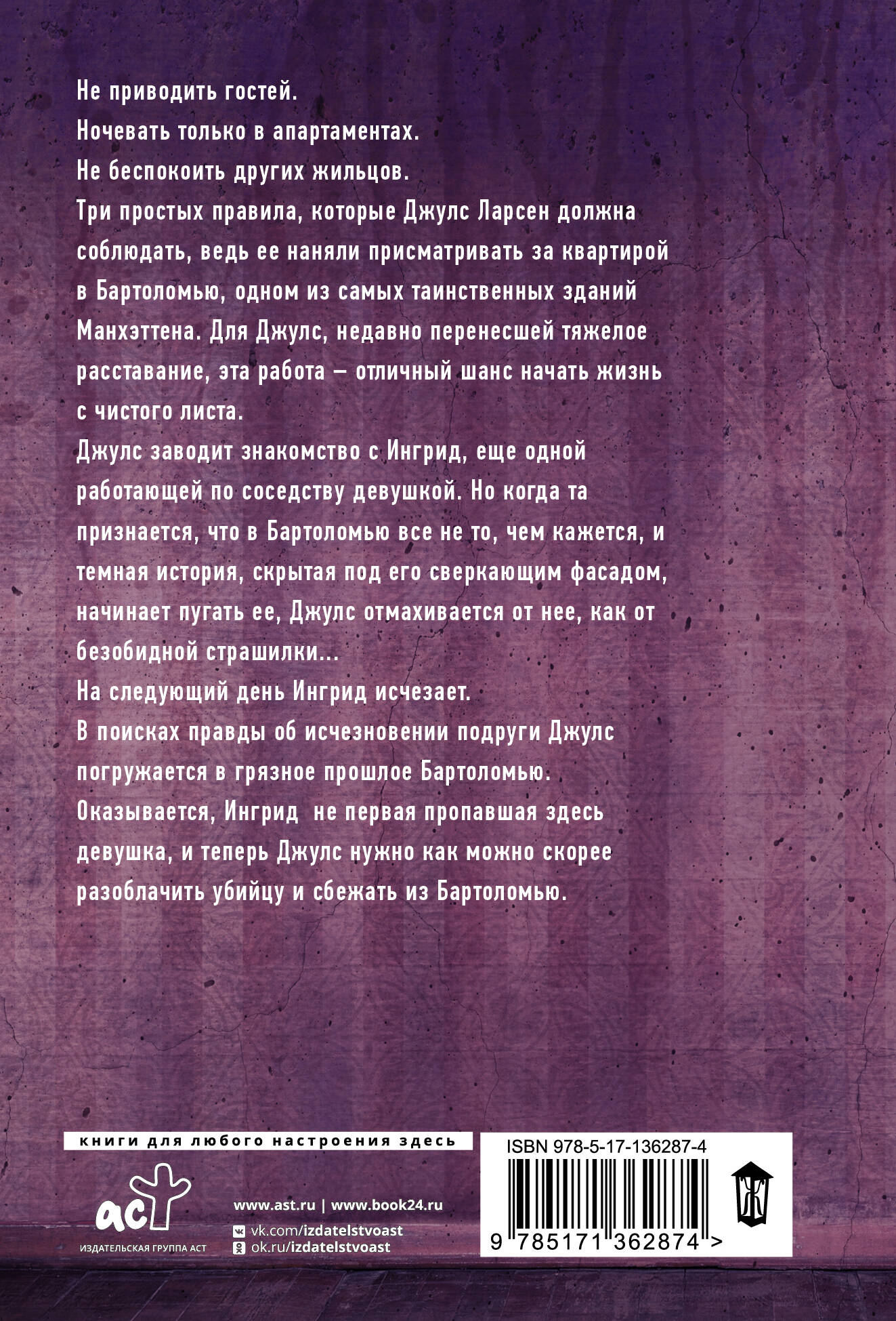 • Бестселлер New York Times • От автора романа «Последние девушки» • Триллер, от которого мурашки по коже Многие мечтают об идеальном доме в шикарном районе, с идеальной обстановкой и знаменитыми соседями. Что если вам предложат пожить в таком доме да ещё и заплатят за это двенадцать тысяч долларов? В таких условиях можно даже закрыть глаза на очень странные и подозрительные правила «работодателя»… У Джулс никого не осталось: родители погибли, сестра пропала без вести, молодой человек изменил, и, как на зло, денег осталось совсем мало. Поэтому девушка без лишних вопросов соглашается на это предложение. Только вот начав жить в идеальном Бартоломью, девушка замечает, что там происходят жуткие вещи. И что ей делать, когда ее соседка Ингрид, также подозревающая неладное, вдруг неожиданно пропадает?