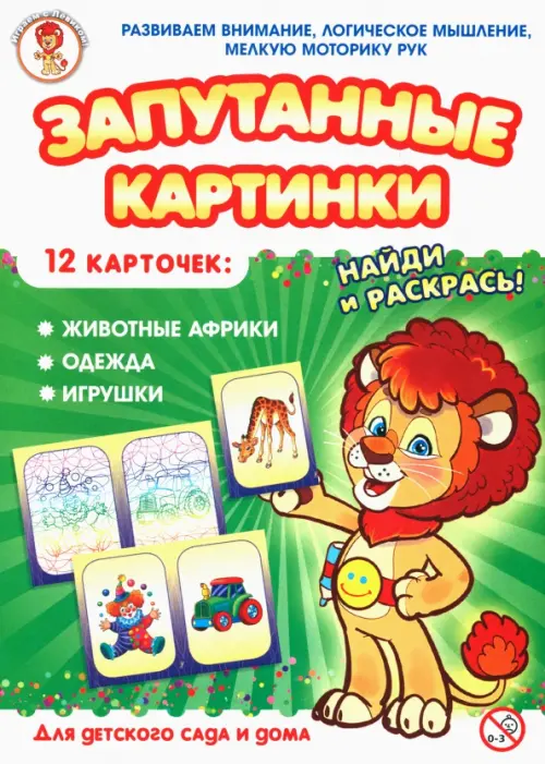 Запутанные картинки - это увлекательная настольная игра для маленьких детей, разработанная опытными и квалифицированными педагогами дошкольного образования. Игра способствует развитию внимания ребёнка, его логического мышления и мелкой моторики рук, а также знакомит детей с предметами окружающего мира, расширяет их кругозор, прививает им эстетические чувства. Набор включает 12 карточек из плотного картона: 6 карточек с цветными объектами и 6 карточек-путаниц. Яркие, красочные картинки привлекут внимание ребёнка и сделают процесс игры более интересным и захватывающим. Правила игры Разрежьте карточки с цветными объектами по пунктирной линии. Разложите все карточки перед ребёнком. Укажите ему на одну из карточек с цветным объектом и предложите найти карточку-путаницу, на которой изображён этот же предмет. Попросите малыша назвать и описать изображённый предмет. Покажите ему, как накрыть карточку-путаницу цветной карточкой. После того, как малыш справится с заданием и правильно разложит все карточки, предложите ему раскрасить карточки-путаницы, используя цветной образец. Можно также предложить ребёнку распределить карточки по тематическим группам (животные Африки, одежда, игрушки). В зависимости от возраста и возможностей ребёнка можно увеличивать или уменьшать количество карточек в игре.