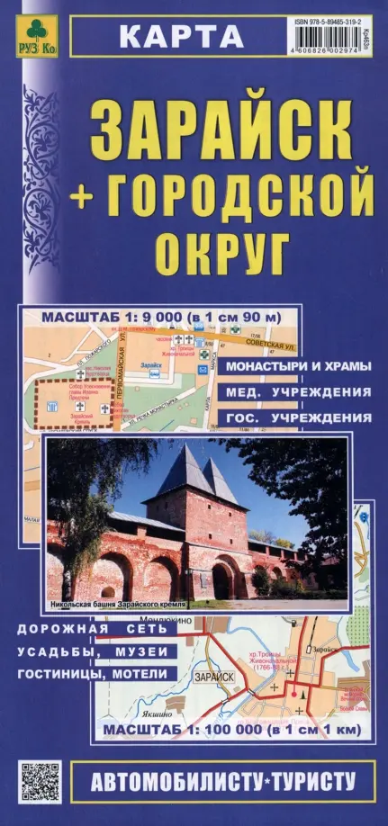 Двусторонняя подробная карта всего района с указанием класса дорог и расстояний между населенными пунктами в километрах. Указано расположение постов ГИБДД, автозаправочных станций. Имеется указатель населенных пунктов. Масштаб 1:100 000. Кроме этого карта содержит подробный план города со всеми улицами, номерами угловых домов. Указано расположение административных зданий и социально-культурных объектов. Масштаб г. Зарайск 1:9 000. Формат 495х695 мм.