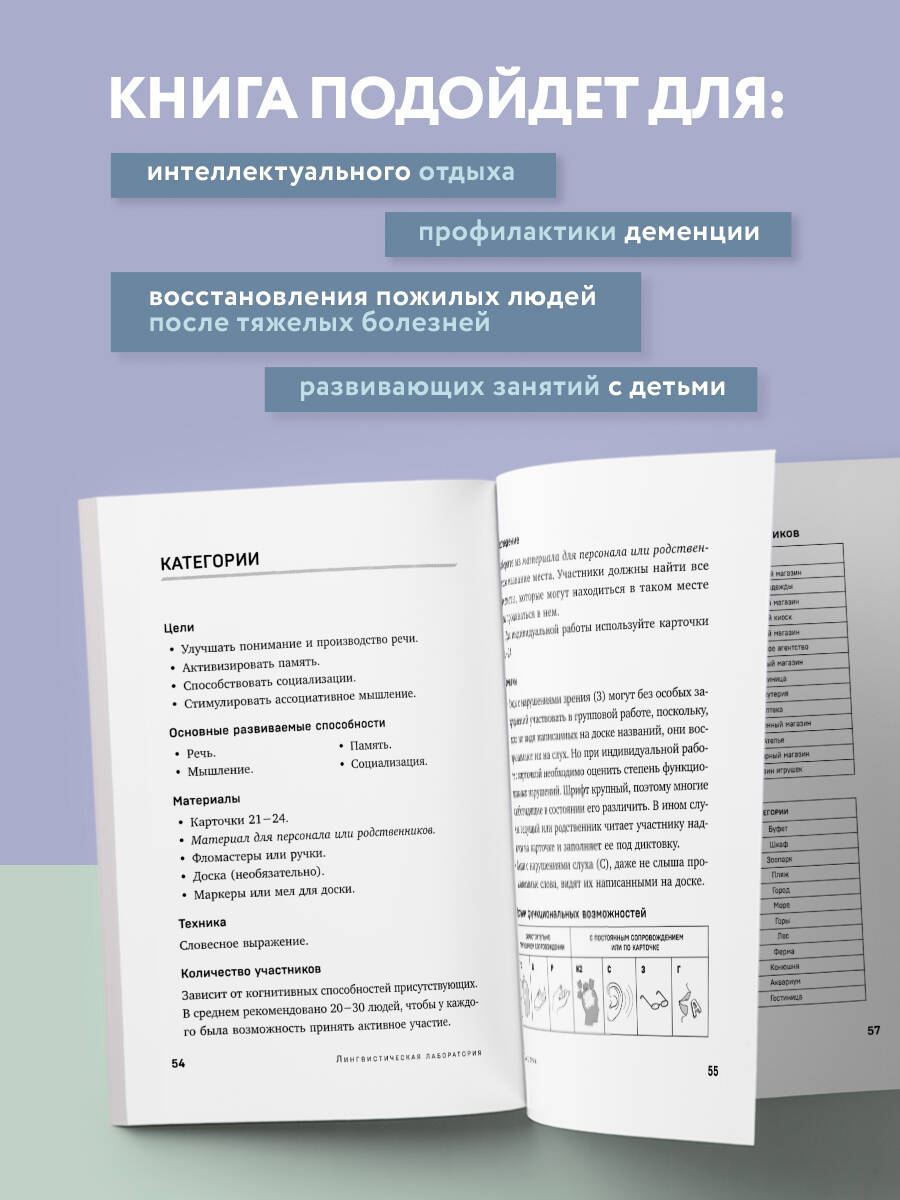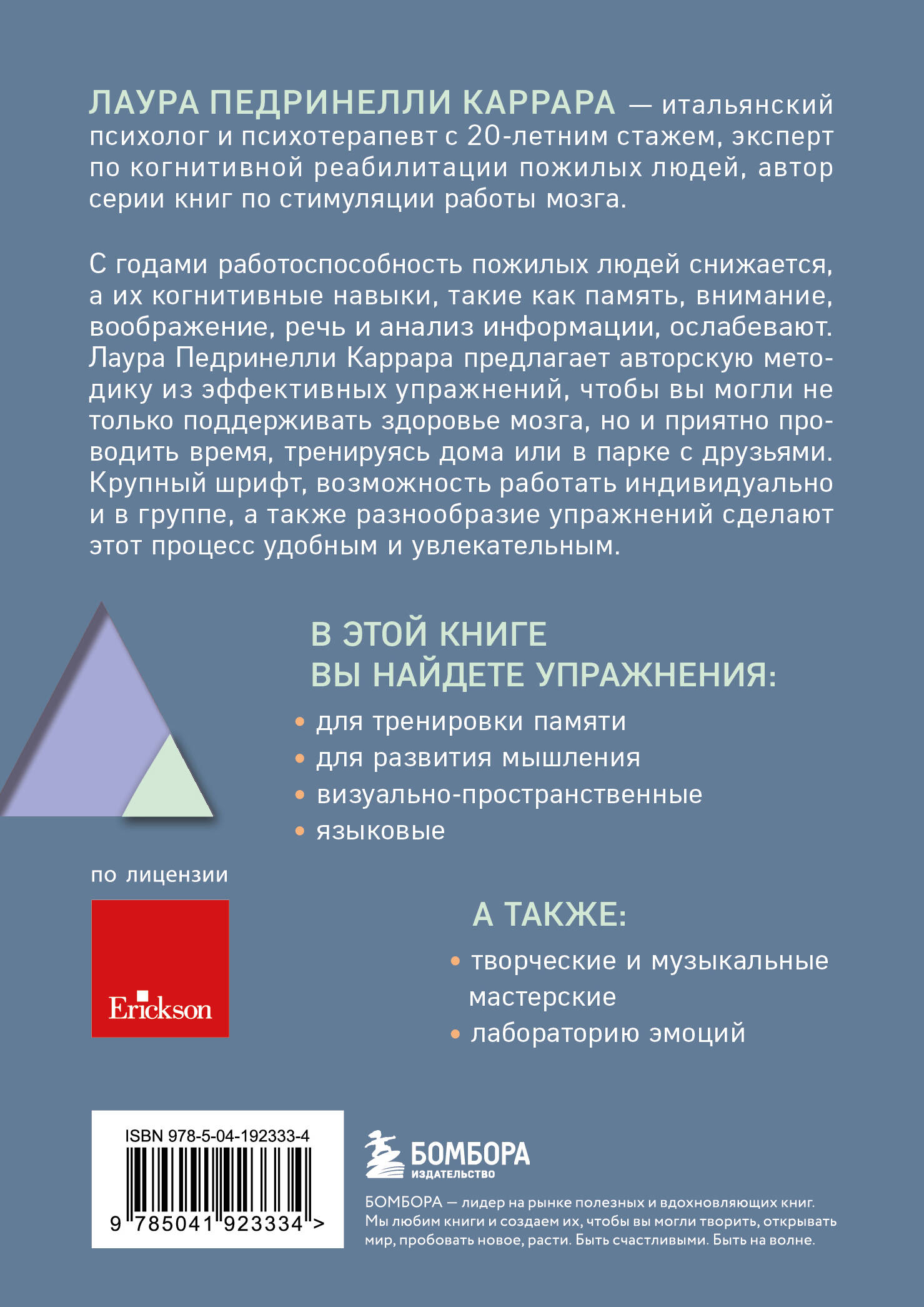 С годами работоспособность пожилых людей снижается, а их когнитивные навыки, такие как память, внимание, воображение, речь и анализ информации, ослабевают. Лаура Педринелли Каррара предлагает авторскую методику из эффективных упражнений, чтобы вы могли не только поддерживать здоровье мозга, но и приятно проводить время, тренируясь дома или в парке с друзьями. Крупный шрифт, возможность работать индивидуально и в группе, а также разнообразие упражнений, сделают этот процесс удобным и увлекательным. В ЭТОЙ КНИГЕ ВЫ НАЙДЕТЕ УПРАЖНЕНИЯ: - для тренировки памяти; - для развития мышления; - визуально-пространственные; - языковые. А ТАКЖЕ: - творческие и музыкальные мастерские; - лабораторию эмоций. Об авторе Лаура Педринелли Каррара - итальянский психолог и психотерапевт с 20-летним стажем, эксперт по когнитивной реабилитации пожилых людей, автор серии книг по стимуляции работы мозга.| Издательство | ООО "Издательство "Эксмо" |