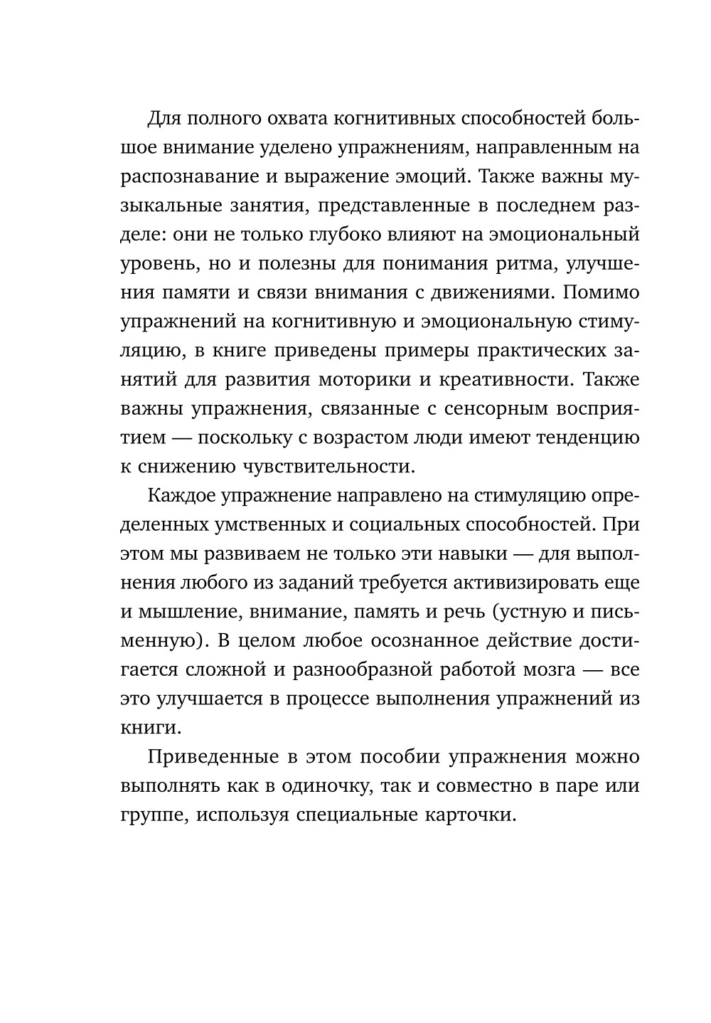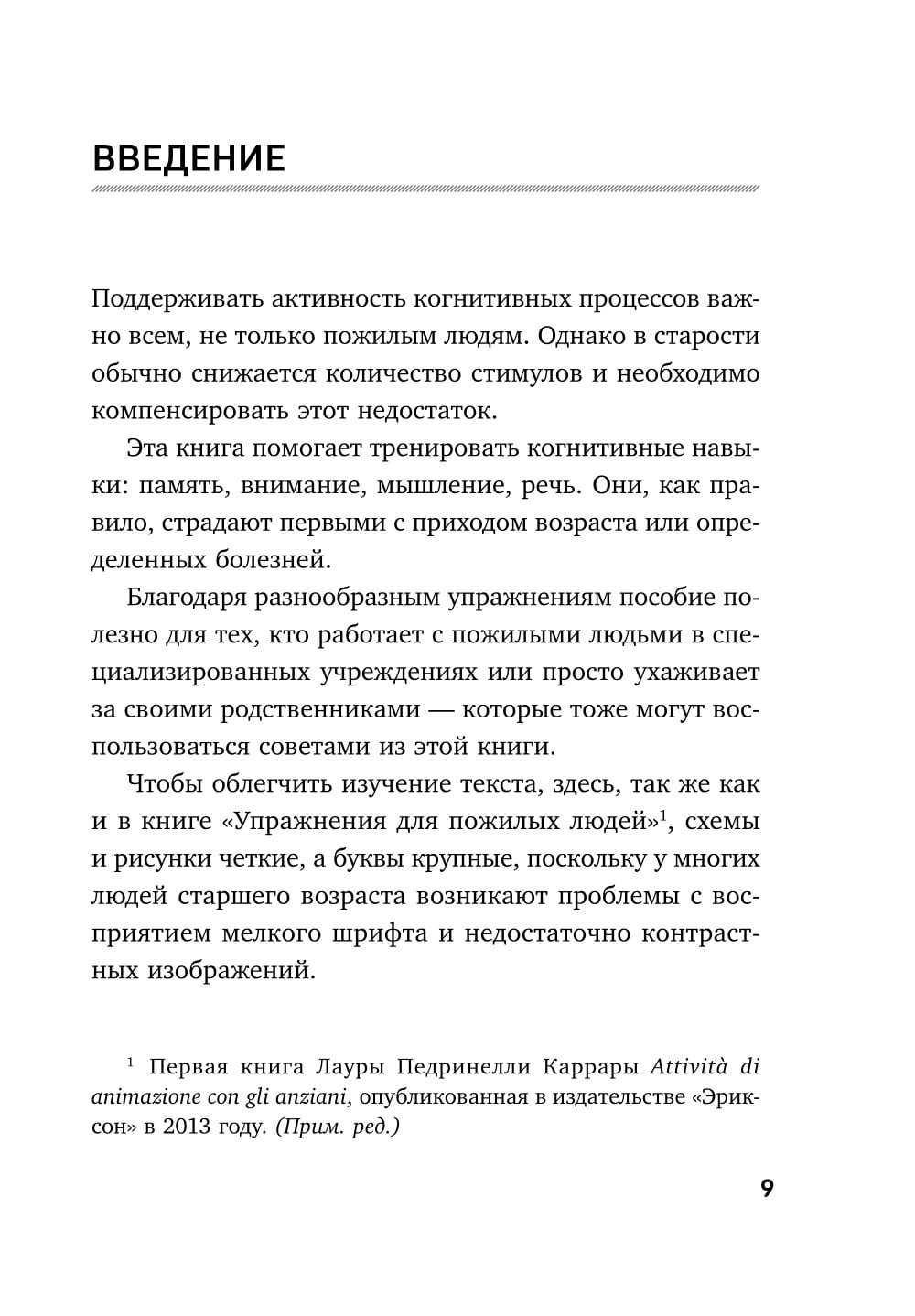 С годами работоспособность пожилых людей снижается, а их когнитивные навыки, такие как память, внимание, воображение, речь и анализ информации, ослабевают. Лаура Педринелли Каррара предлагает авторскую методику из эффективных упражнений, чтобы вы могли не только поддерживать здоровье мозга, но и приятно проводить время, тренируясь дома или в парке с друзьями. Крупный шрифт, возможность работать индивидуально и в группе, а также разнообразие упражнений, сделают этот процесс удобным и увлекательным. В ЭТОЙ КНИГЕ ВЫ НАЙДЕТЕ УПРАЖНЕНИЯ: - для тренировки памяти; - для развития мышления; - визуально-пространственные; - языковые. А ТАКЖЕ: - творческие и музыкальные мастерские; - лабораторию эмоций. Лаура Педринелли Каррара - итальянский психолог и психотерапевт с 20-летним стажем, эксперт по когнитивной реабилитации пожилых людей, автор серии книг по стимуляции работы мозга.| Издательство | Эксмо |