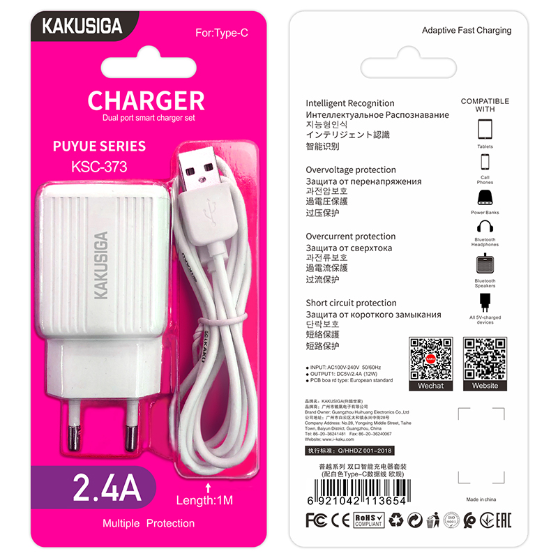 Зарядное устройство KAKUSIGA KSC-373 | 12 Вт | 2,4 А + кабель USB-C 1 м белый
