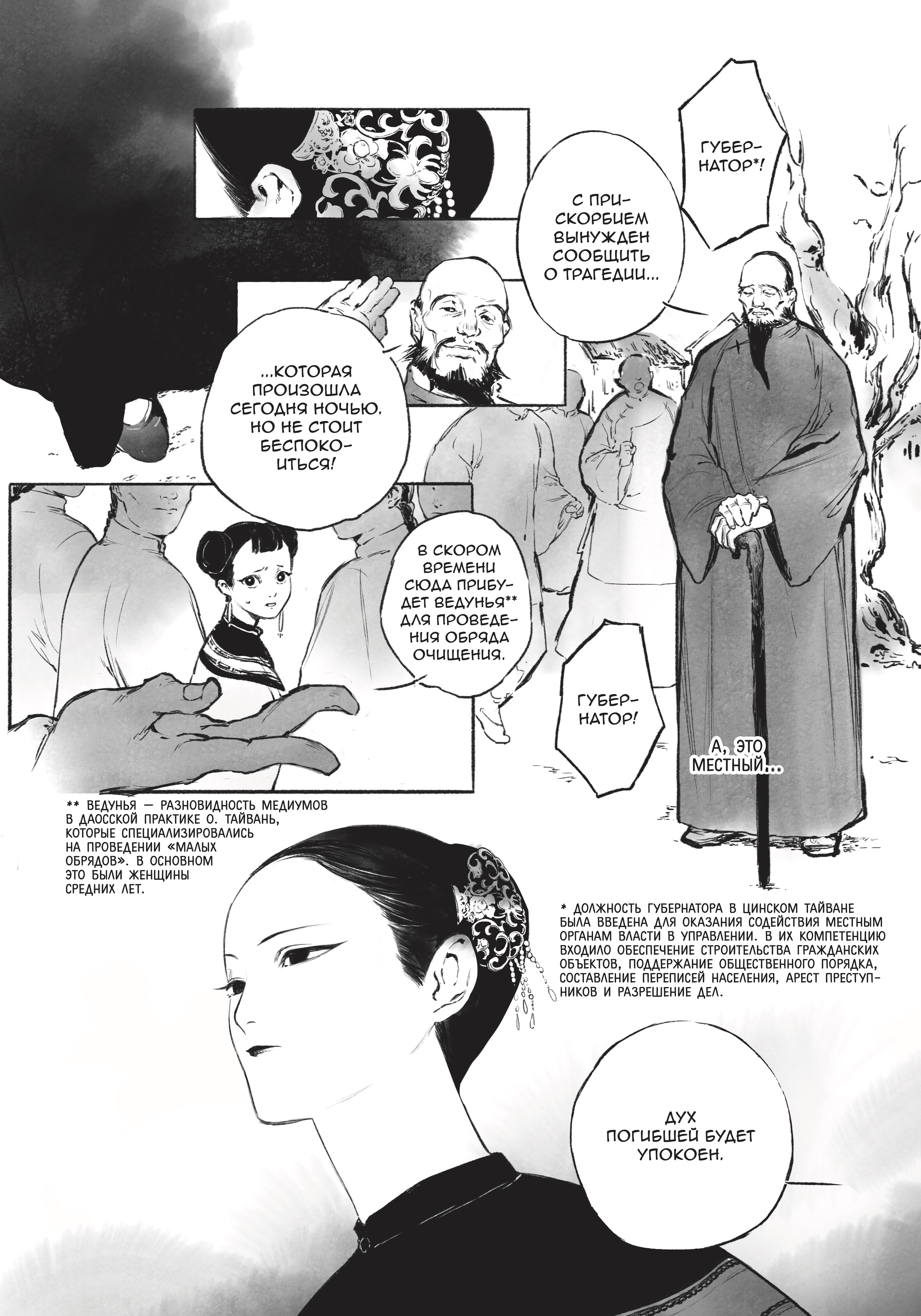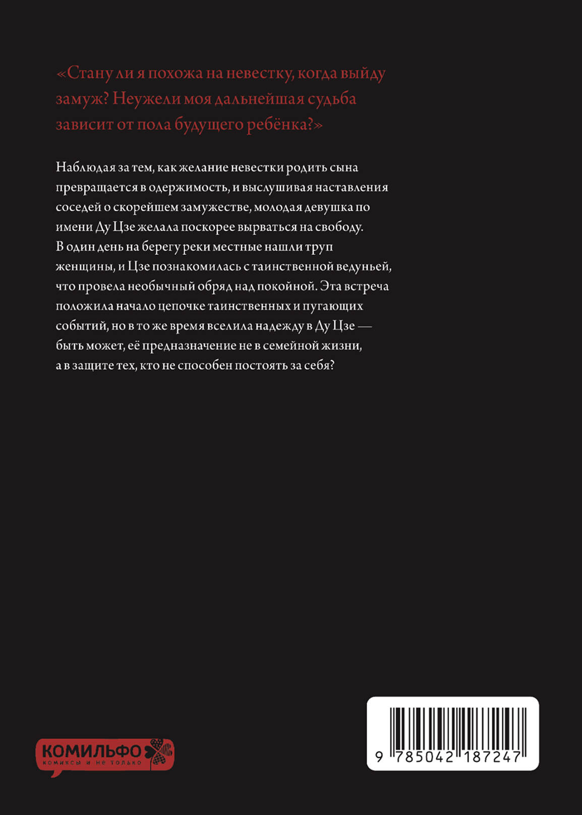 «Стану ли я похожа на невестку, когда выйду замуж? Неужели моя дальнейшая судьба зависит от пола будущего ребёнка?» Наблюдая за тем, как желание невестки родить сына превращается в одержимость, и выслушивая наставления соседей о скорейшем замужестве, молодая девушка по имени Ду Цзе желала поскорее вырваться на свободу. В один день на берегу реки местные нашли труп женщины, и Цзе познакомилась с таинственной ведуньей, что провела необычный обряд над покойной. Эта встреча положила начало цепочке таинственных и пугающих событий, но в то же время вселила надежду в Ду Цзе - быть может, её предназначение не в семейной жизни, а в защите тех, кто не способен постоять за себя? Сюжет основан на одной из трёх важнейших легенд города Тайнань - комикс станет отличным погружением в необычную мифологию Тайваня. Детектив с мистическими элементами - первый том заканчивается на очень интересном моменте!| Издательство | ООО "Издательство "Эксмо" |