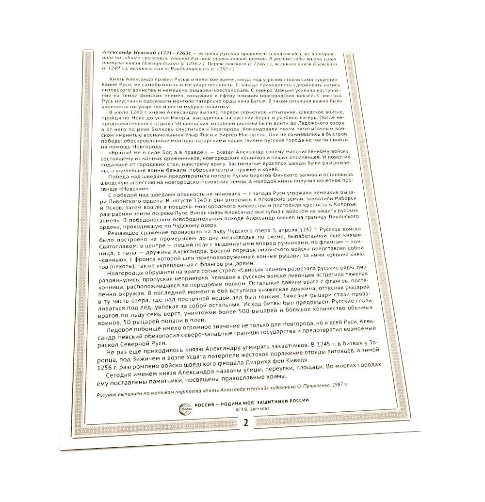 Комплект демонстрационных материалов " Защитники России" посвящен выдающимся полководцам Х-ХIХ веков. Защищать Отечество считалось на Руси делом чести. Каждое столетие рождало своих героев, способных вести за собой народ, защищать родную землю, отстаивать национальную самобытность и великие традиции. Тексты и иллюстративный материал помогут детям познакомиться с важными историческими событиями и прочувствовать сопричастность к героическому прошлому родной страны.| Издательство | Творческий центр Сфера |