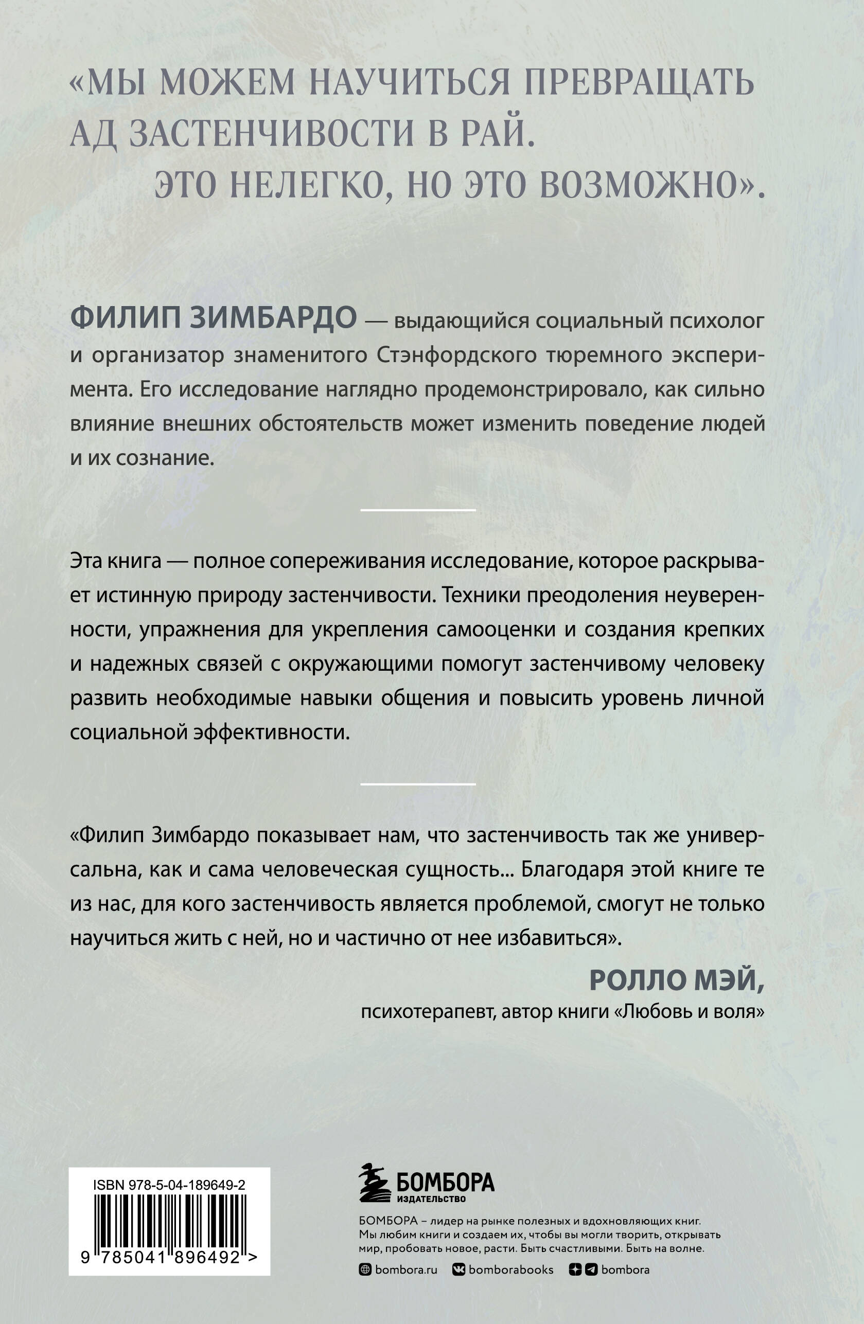 «Мы можем научиться превращать ад застенчивости в рай. Это нелегко, но это возможно». Застенчивость заключает человека во внутреннюю тюрьму, из которой приходится выбираться годами. Ее последствия - это больше, чем робость перед незнакомыми людьми и неуверенность в себе. Из-за нее человек: - не раскрывает свой потенциал и живет в рамках, которые навязал себе сам или общество; - не может завести близких отношений и глубоко закрывается в себе; - отказывается от социальных связей и становится узником своих мыслей; - не выражает собственное мнение и и не отстаивает свои права. Если какое-то из перечисленных состояний близко вам, книга Филипа Зимбардо, социального психолога и автора бестселлера «Эффект Люцифера», поможет понять природу своей застенчивости, определить личные проблемы в зависимости от ее типа и обрести необходимые социальные навыки и уверенность в себе. Из этой книги вы узнаете: - Какую роль играет семья, школа и общество в программировании человека на застенчивость? - Какие люди или ситуации заставляют вас чувствовать себя застенчивым и почему? - Как изменить отношение к себе и не быть в плену ярлыка «застенчивого человека»? - Как не дать застенчивости стать одним из главных препятствий на пути к близким отношениям?