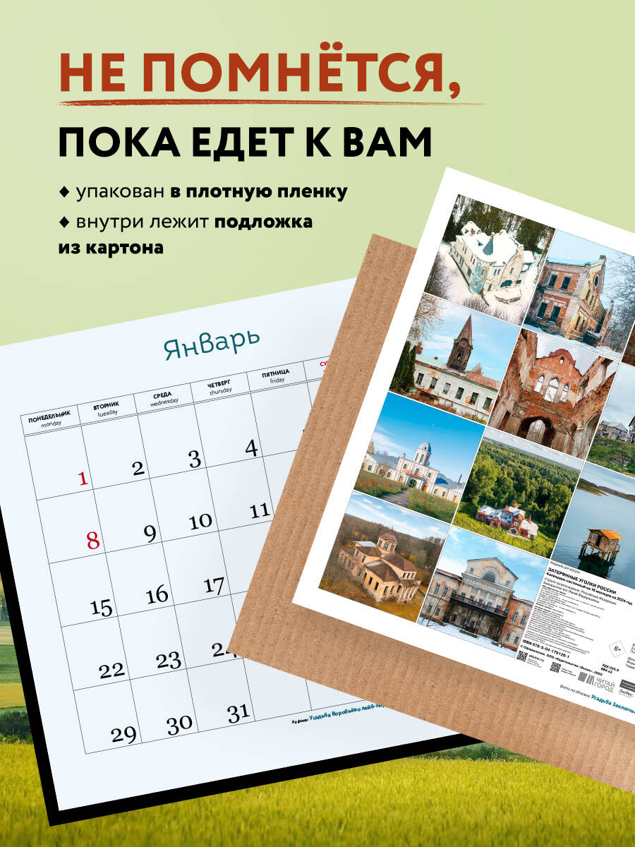 О серии: Наши настенные календари отличаются высоким качеством исполнения! Тщательно подобранные иллюстрации, напечатанные на глянцевой бумаге высочайшего качества, станут настоящим украшением дома, а в календарной сетке найдется место для ваших планов: большие клетки позволят делать записи и организовать свой год! В серии настенных календарей издательства «ЭКСМО» каждый найдет тему по вкусу: великие художники, великолепные подборки с самыми знаменитыми произведениями искусства, легендарные кинематографические саги и игры, главные книжные авторы и бестселлеры, фотографии и иллюстрации любимых животных и многое-многое другое! О календаре: В календаре подобраны красочные завораживающие фотографии покинутых мест в России. Каждый новый месяц подарит загадочную и неповторимую атмосферу. Благодаря большому формату и высокому качеству изображений этот календарь может стать отличным дополнением интерьера. В нем также отмечены выходные дни, а просторная сетка позволяет удобно планировать время и записывать важные события. А еще включен дополнительный разворот с первыми 4 месяцами 2025 года! Для кого: Завораживающие фотографии заброшенных мест, напечатанные на высококачественной бумаге, понравятся тем, кто любит старую архитектуру и мистические места. Технические параметры: - Тип календаря - настенный перекидной. - Год - 2024. - Календарная сетка - с разбивкой по месяцам. - Вид скрепления - скрепка. - Ширина - 30 см. - Высота - 30 см. - Внутренний блок - мелованная бумага 150 г/м2. - Подложка - плотный гофрокартон для поддержания формы. - Индивидуальная упаковка в плотный целлофановый пакет.