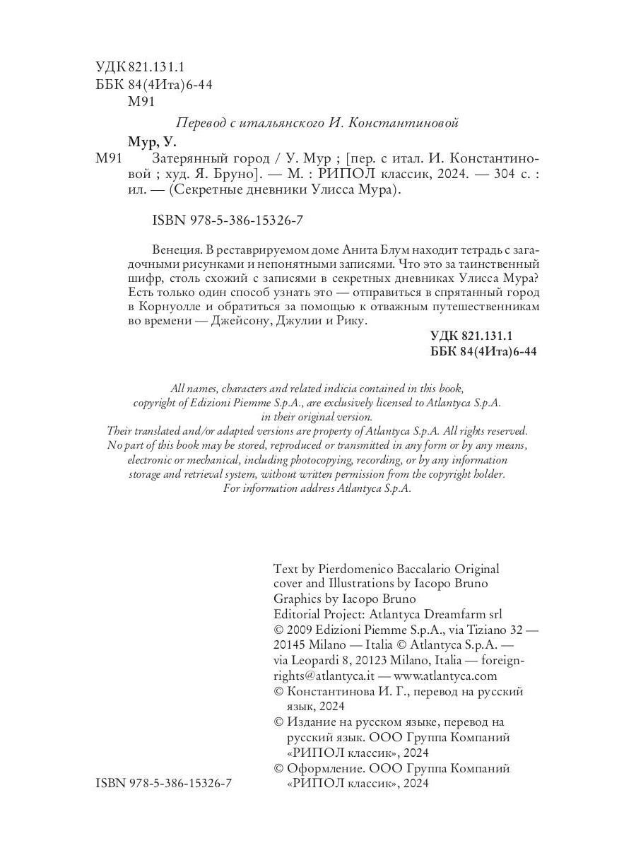Венеция. В реставрируемом доме Анита Блум находит тетрадь с загадочными рисунками и непонятными записями. Что это за таинственный шифр, столь схожий с записями в секретных дневниках Улисса Мура? Есть только один способ узнать это - отправиться в спрятанный город в Корнуолле и обратиться за помощью к отважным путешественникам во времени - Джейсону, Джулии и Рику.