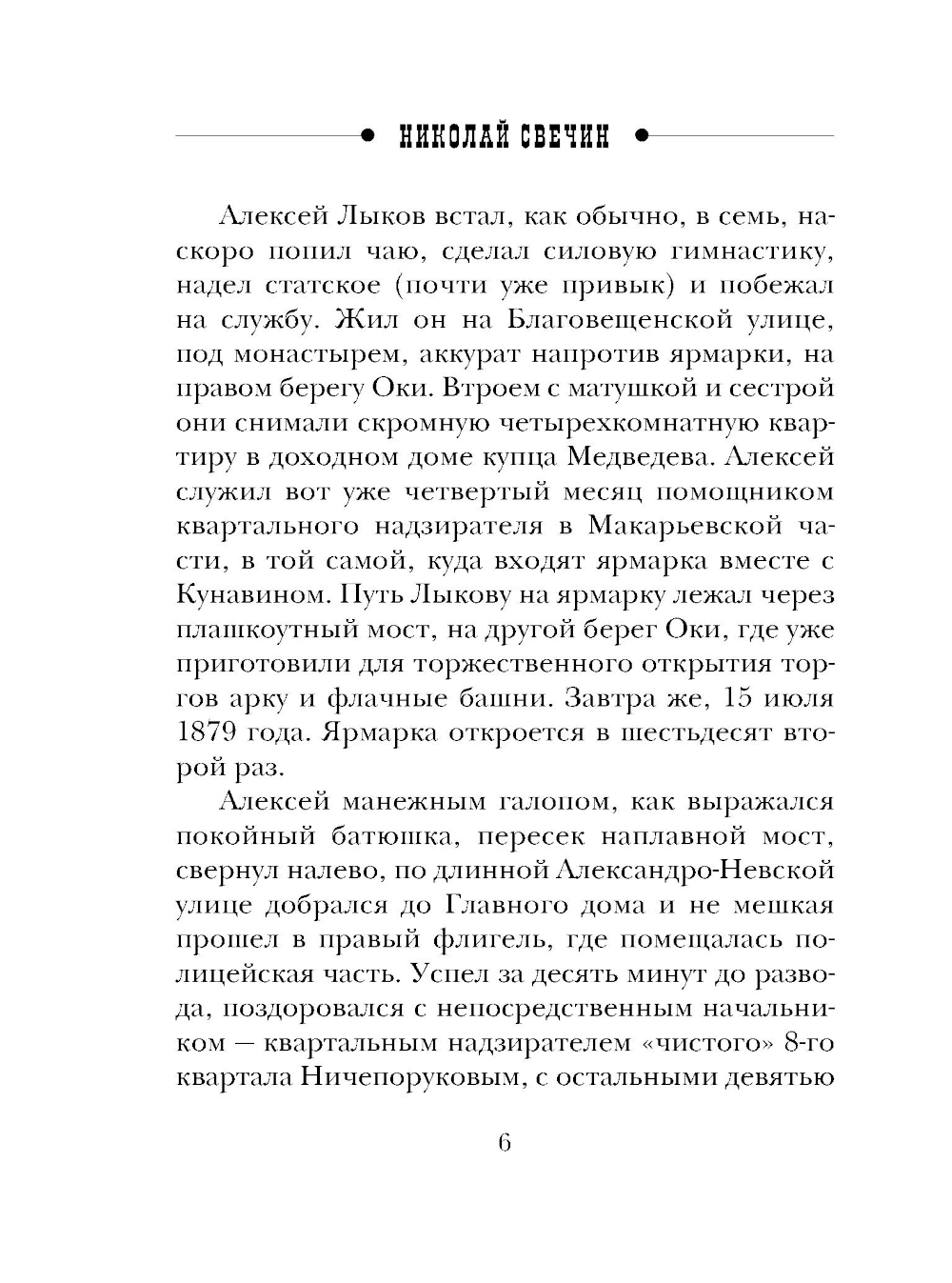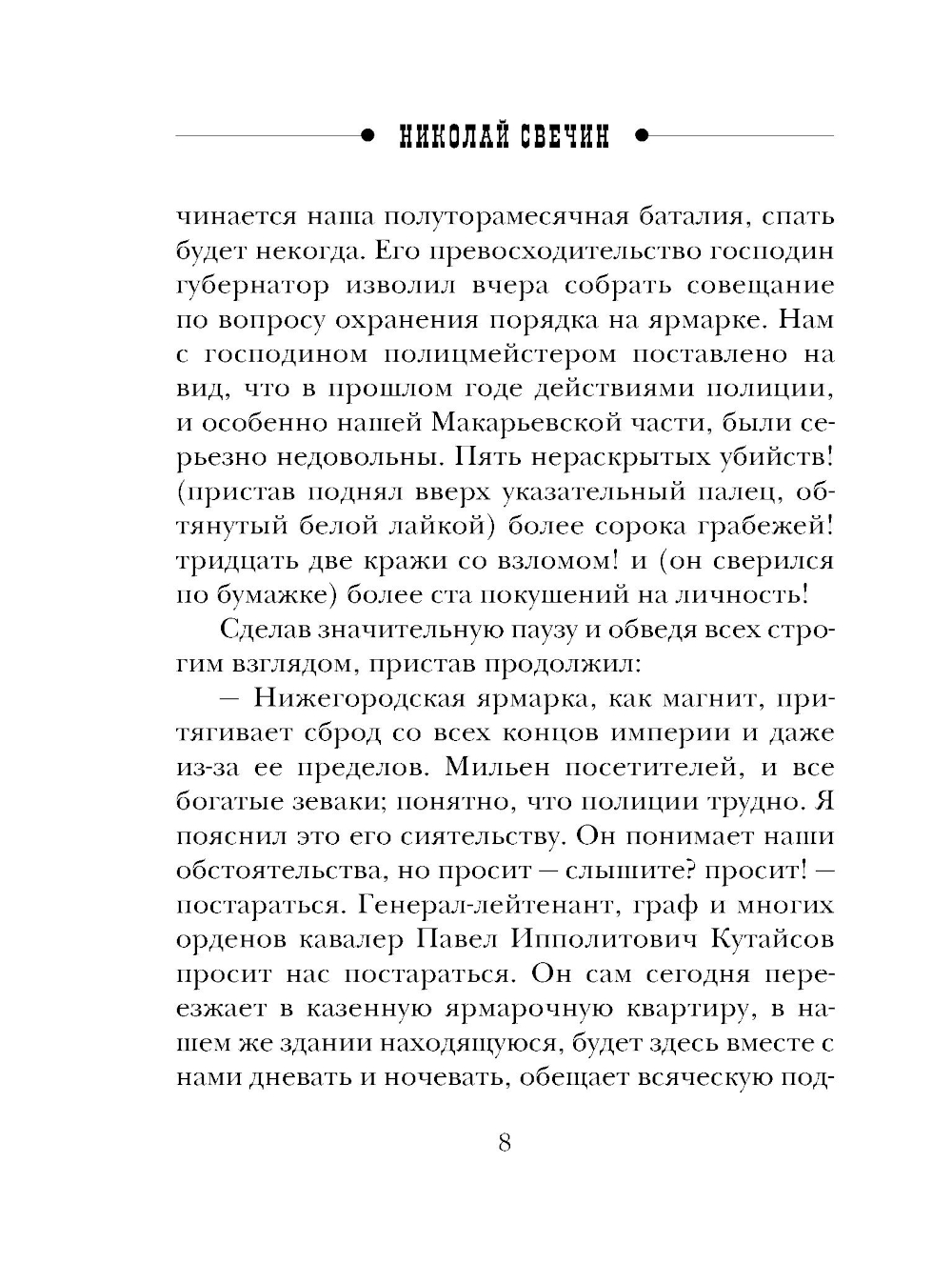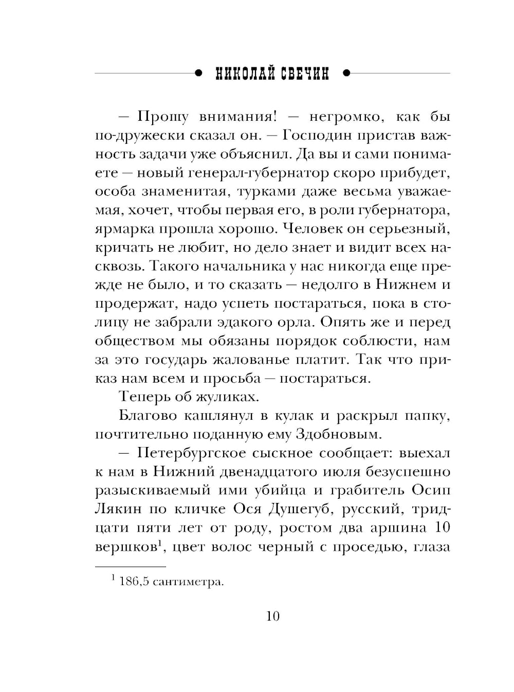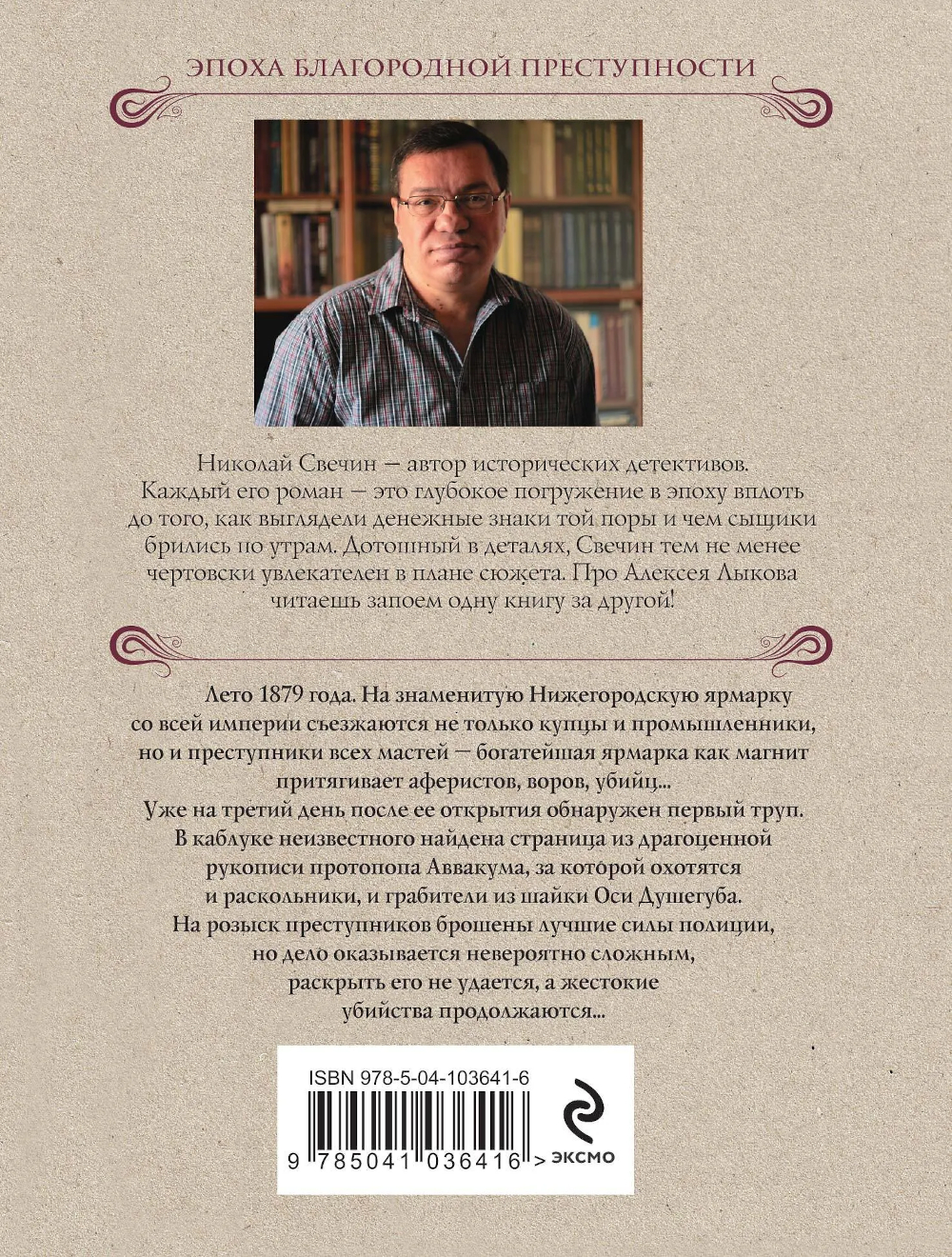 Николай Свечин - один из самых известных авторов исторических детективов, номинант премии «Русский детектив» и лидер в своей нише. Самая знаменитая серия Свечина - серия про расследования Алексея Лыкова. Она насчитывает уже более 20 романов и сборников, в каждом из которых - отдельная история преступлений, но узнаваемые герои. Эффект остросюжетного сериала. Лето 1879 года. На знаменитую Нижегородскую ярмарку со всех концов Российской Империи съезжаются не только купцы и промышленники, но и преступники всех мастей - богатейшая ярмарка как магнит притягивает аферистов, воров, убийц... Уже за день до её открытия обнаружен первый труп. В каблуке неизвестного найдена страница из драгоценной рукописи протопопа Аввакума, за которой охотятся и раскольники, и грабители из шайки Оси Душегуба. На розыск преступников брошены лучшие силы полиции, но дело оказывается невероятно сложным, раскрыть его не удаётся, а жестокие убийства продолжаются...| Издательство | Эксмо |