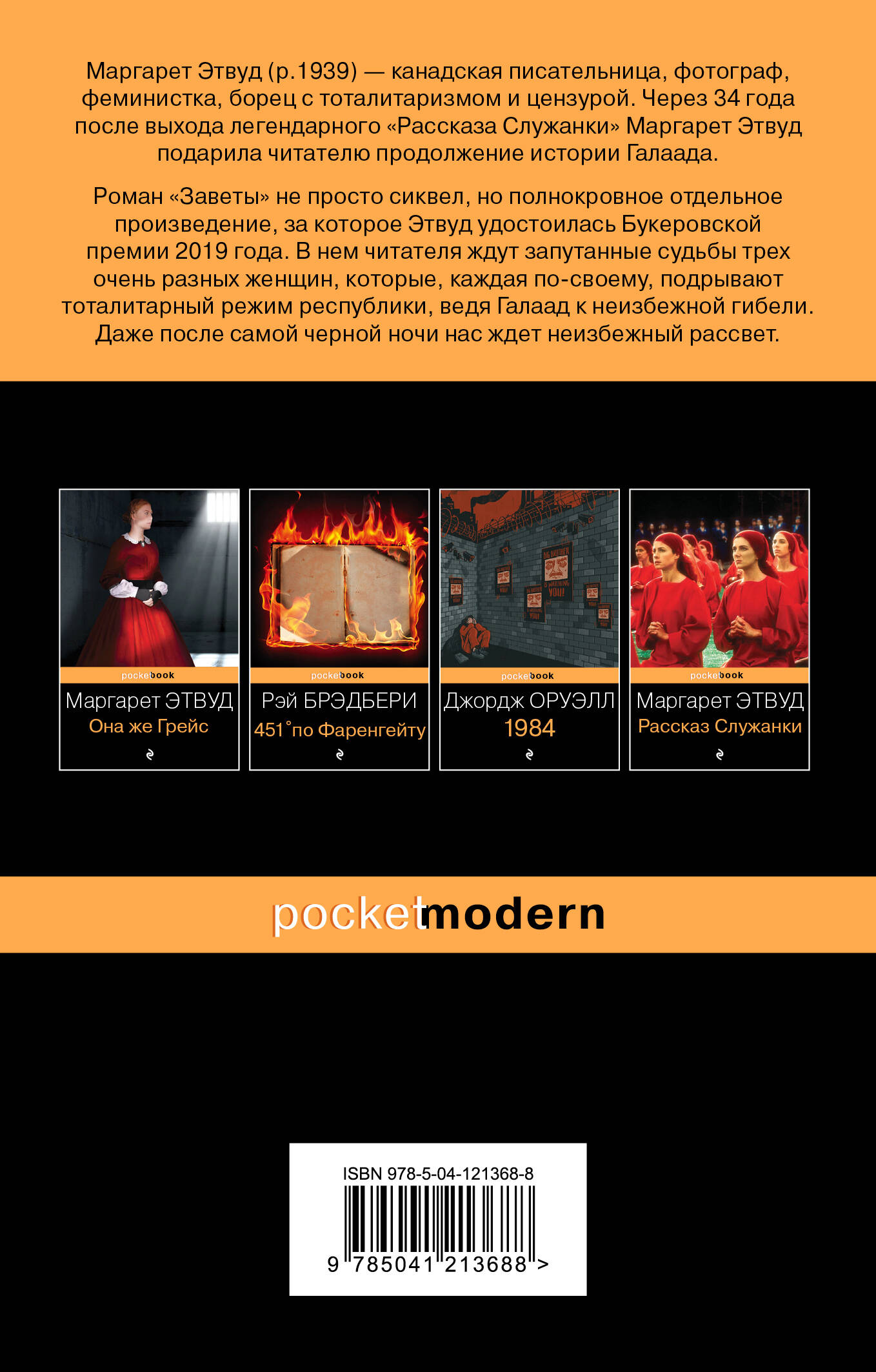 Через 34 года после выхода легендарного «Рассказа служанки» Маргарет Этвуд подарила читателю продолжение истории Галаада. Роман «Заветы» не просто сиквел, но полнокровное отдельное произведение, за которое Этвуд удостоилась Букеровской премии 2019 года. В нем читателя ждут запутанные судьбы трех очень разных женщин, которые, каждая по-своему, подрывают тоталитарный режим республики, ведя Галаад к неизбежной гибели. Даже после самой черной ночи нас ждет неизбежный рассвет.| Издательство | Эксмо |