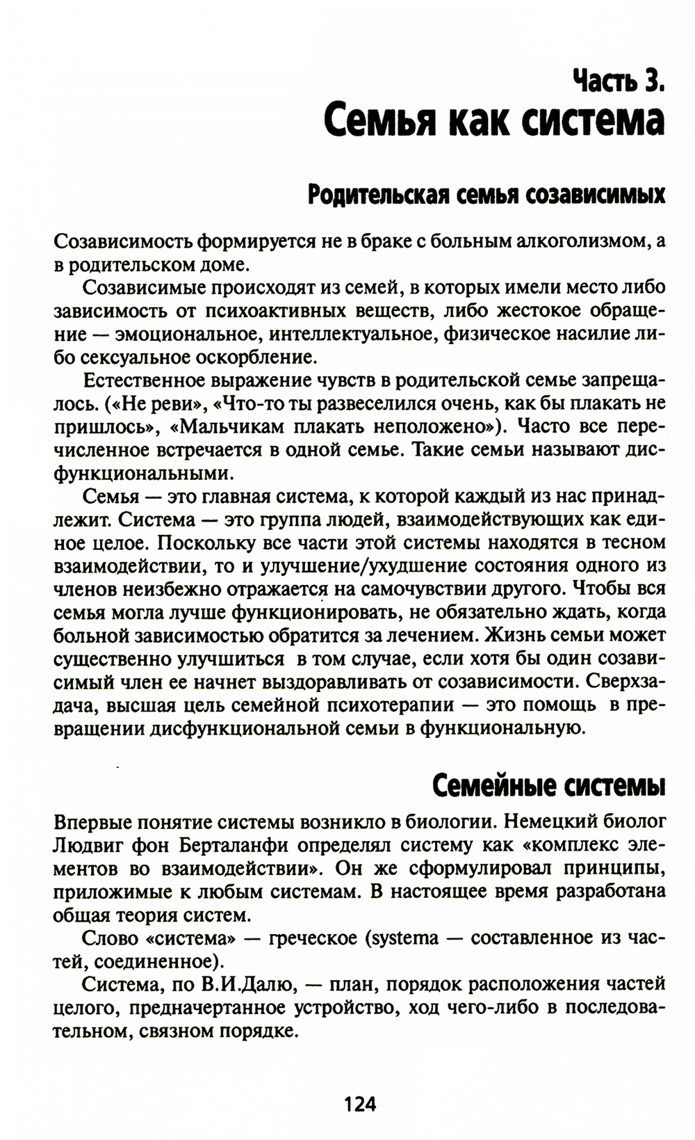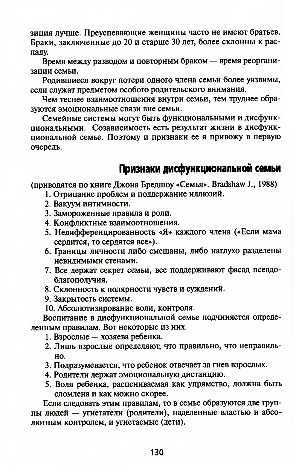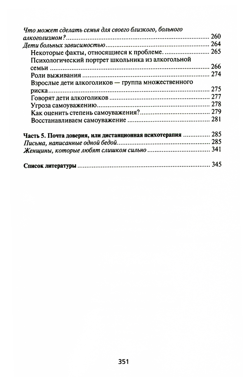 Книга посвящена психологии зависимости от психоактивных веществ (алкоголизм, наркомания) и «(зависимости. Созависимость - это психологическое состояние членов семьи больного. Трезво живущие родственники таких больных эмоционально вовлечены в эту болезнь. Родственники не только сами страдают, но и строят такие взаимоотношения в семье, которые препятствуют выздоровлению больного. Созависимостью страдают жены, матери, братья, сестры, взрослые дети и даже внуки больного алкоголизмом или наркоманией. Сами больные также характеризуются признаками («зависимости до развития болезни либо после наступления трезвости. Созависимые родители не могут успешно выполнять свои родительские функции, страдают дети. Происходит повторение нежелательных событий в семье. Взрослые дети составляют группу высокого риска множественных проблем: развития зависимости, психосоматических заболеваний, тревожно-депрессивных состояний, часто они вступают в трудный брак. Описаны закономерности жизни таких семей (дисфункциональная семья). Созависимость излечима. Впервые в России предложена программа преодоления созависимости. Исцеление приводит к более гармоничным взаимоотношениям в семье, служит профилактикой возникновения зависимости у детей. Книга написана языком, доступным для родственников и друзей больных. В то же время книга может быть руководством для психологов, психотерапевтов, наркологов, психиатров, социальных работников в работе с больными и их семьями.| Издательство | Изд.Базенков И.Л. |