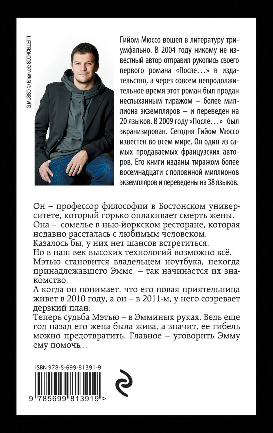 «История любви, которая бросает вызов законам времени». - Le Figaro littéraire Гийом Мюссо вошел в литературу триумфально. В 2004 году никому не известный автор отправил рукопись своего первого романа, «После…», в издательство, а через совсем непродолжительное время этот роман был продан неслыханным тиражом - более миллиона экземпляров - и переведен на 20 языков. В 2009 году «После…» был экранизирован. Сегодня Гийом Мюссо известен во всем мире. Он один из самых продаваемых французских авторов. Его книги переведены на 42 языка. Он - профессор философии в Бостонском университете, который горько оплакивает смерть жены. Она - сомелье в нью-йоркском ресторане, которая недавно рассталась с любимым человеком. Казалось бы - у них нет шансов встретиться. Но в наш век высоких технологий возможно всё. Мэтью становится владельцем ноутбука, некогда принадлежавшего Эмме, - так начинается их знакомство. А когда он понимает, что его новая приятельница живет в 2010 году, а он - в 2011-м, у него созревает дерзкий план. Теперь судьба Мэтью - в руках Эммы. Ведь еще год назад его жена была жива, а значит, ее гибель можно предотвратить. Главное - уговорить Эмму ему помочь…| Издательство | ООО "Издательство "Эксмо" |