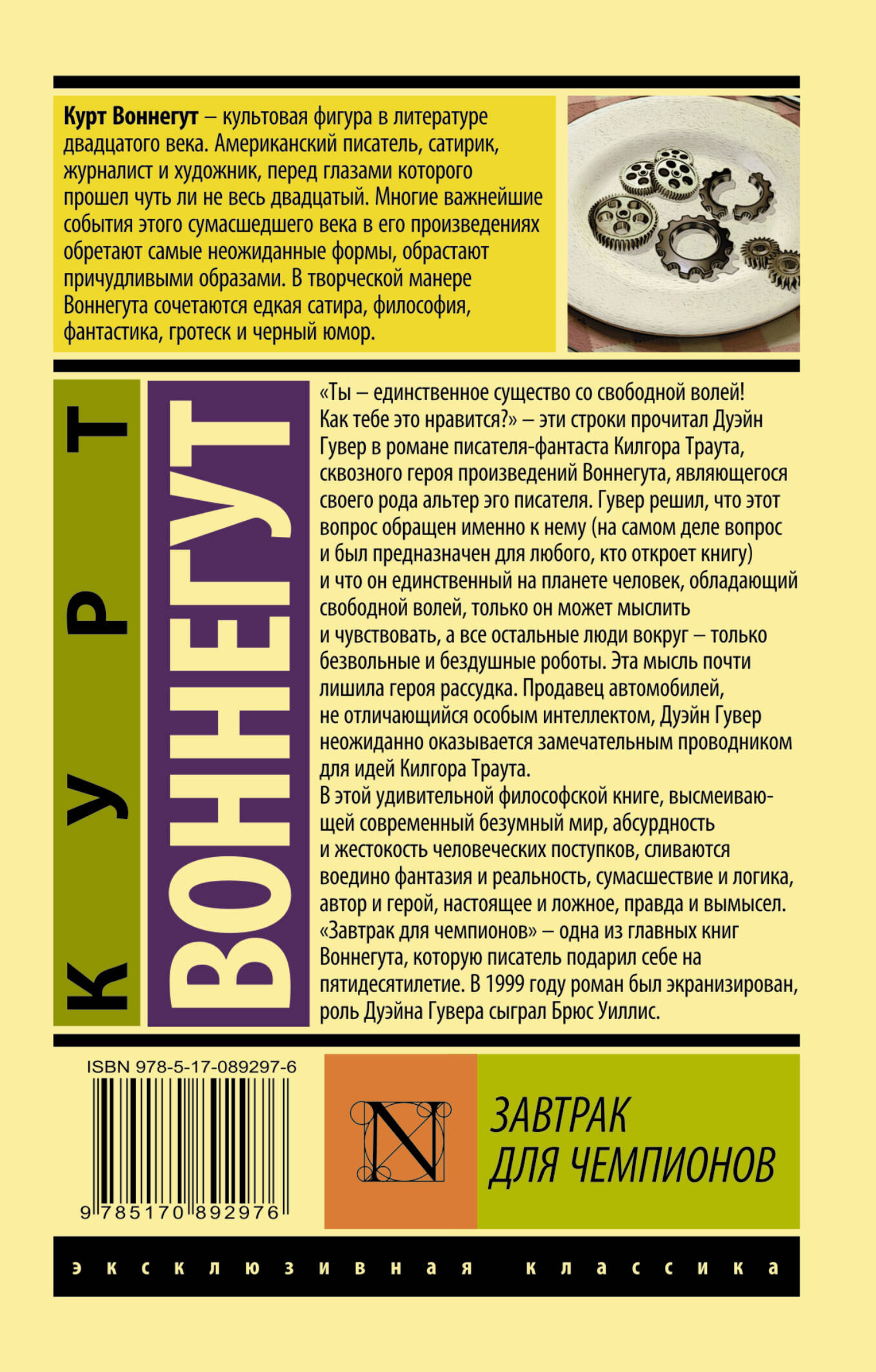 "Ты - единственное существо со свободной волей! Как тебе это нравится?" - эти строки прочитал Дуэйн Гувер в романе писателя-фантаста Килгора Траута, сквозного героя произведений Воннегута, являющегося своего рода альтер эго писателя. Гувер решил, что этот вопрос обращен именно к нему (на самом деле вопрос и был предназначен для любого, кто откроет книгу) и что он единственный на планете человек, обладающий свободной волей, только он может мыслить и чувствовать, а все остальные люди вокруг - только безвольные и бездушные роботы. Эта мысль почти лишила героя рассудка. Продавец автомобилей, не отличающийся особым интеллектом, Дуэйн Гувер неожиданно оказывается замечательным проводником для идей Килгора Траута. В этой удивительной философской книге, высмеивающей современный безумный мир, абсурдность и жестокость человеческих проступков, сливаются воедино фантазия и реальность, сумасшествие и логика, автор и герой, настоящее и ложное, правда и вымысел. "Завтрак для чемпионов" - одна из главных книг Воннегута, которую писатель подарил себе на пятидесятилетие. В 1999 году роман был экранизирован, роль Дуэйна Гувера сыграл Брюс Уиллис.