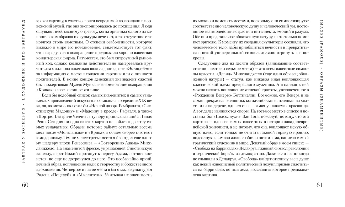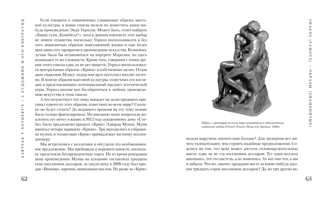 «Завтрак у Sotheby's» Филипа Хука - остроумное и увлекательное исследование феномена искусства и его коммерческой стоимости. В центре внимания известного английского искусствоведа, сотрудника знаменитых аукционных домов «Сотби» и «Кристи», не понаслышке знакомого с таинственной, скрытой от глаз дилетантов жизнью рынка искусства, - секрет популярности отдельных художников и творческих направлений, отношения художников и моделей, истории нашумевших похищений и подделок. Что сколько стоит? Почему произведение становится «иконой»? Кто из художников сумел создать собственный бренд? Можно ли уберечься от подделок? Как украли «Мону Лизу»? Филип Хук проведет читателя по лабиринтам арт-рынка и предложит собственные ответы на эти и многие другие вопросы.