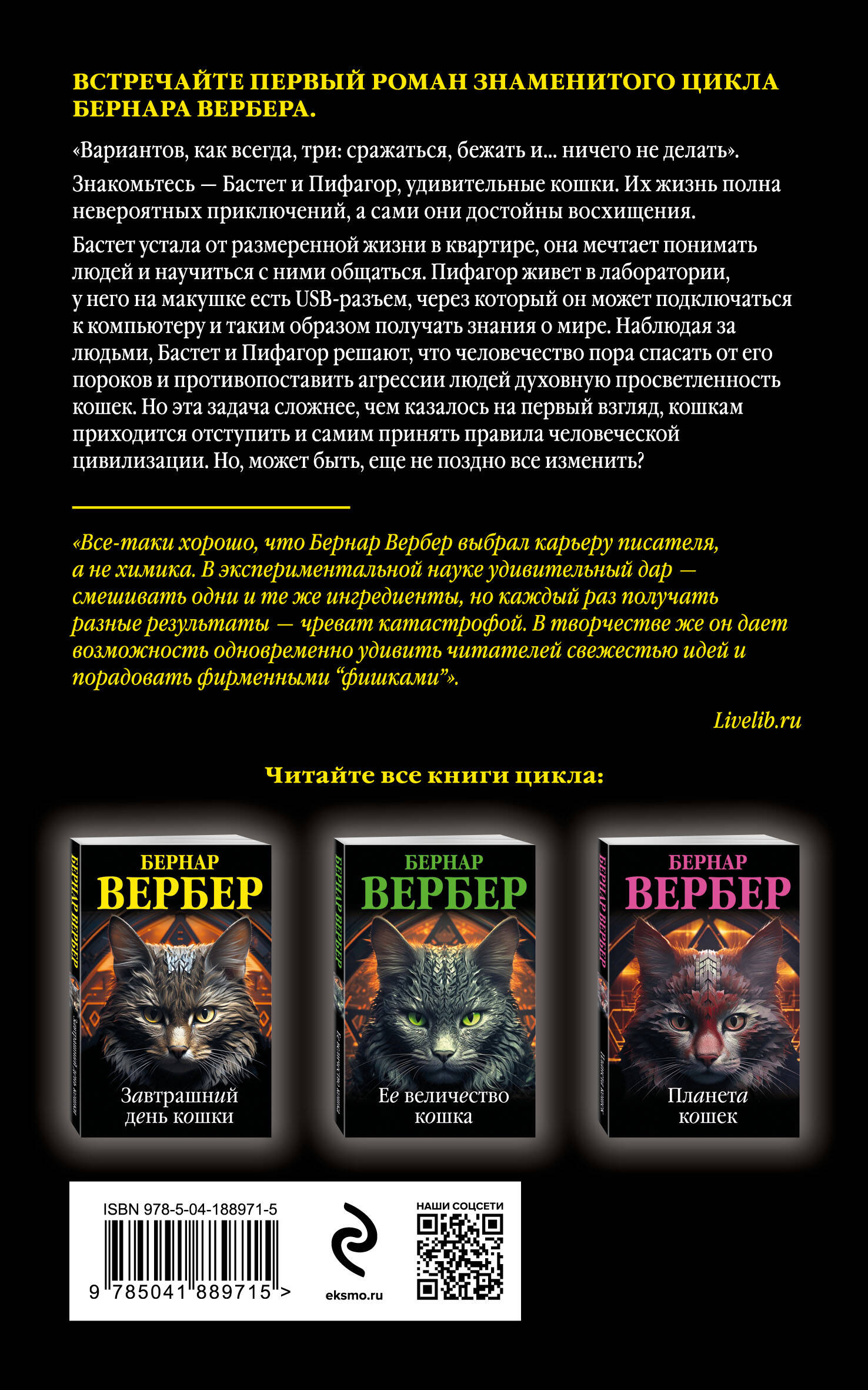 НОВОЕ ОФОРМЛЕНИЕ ЗНАМЕНИТОГО ЦИКЛА БЕРНАРА ВЕРБЕРА ПО ДОСТУПНОЙ ЦЕНЕ! Первая часть цикла. «Вариантов, как всегда, три: сражаться, бежать и... ничего не делать». Знакомьтесь - Бастет и Пифагор, удивительные кошки. Их жизнь полна невероятных приключений, а сами они достойны восхищения. Бастет устала от размеренной жизни в квартире, она мечтает понимать людей и научиться с ними общаться. Пифагор живет в лаборатории, у него на макушке есть USB-разъем, через который он может подключаться к компьютеру и таким образом получать знания о мире. Наблюдая за людьми, Бастет и Пифагор решают, что человечество пора спасать от его пороков и противопоставить агрессии людей духовную просветленность кошек. Но эта задача сложнее, чем казалось на первый взгляд, кошкам приходится отступить и самим принять правила человеческой цивилизации. Но, может быть, еще не поздно все изменить? «Все-таки хорошо, что Бернар Вербер выбрал карьеру писателя, а не химика. В экспериментальной науке удивительный дар - смешивать одни и те же ингредиенты, но каждый раз получать разные результаты - чреват катастрофой. В творчестве же он дает возможность одновременно удивить читателей свежестью идей и порадовать фирменными "фишками"». - livelib| Издательство | ООО "Издательство "Эксмо" |