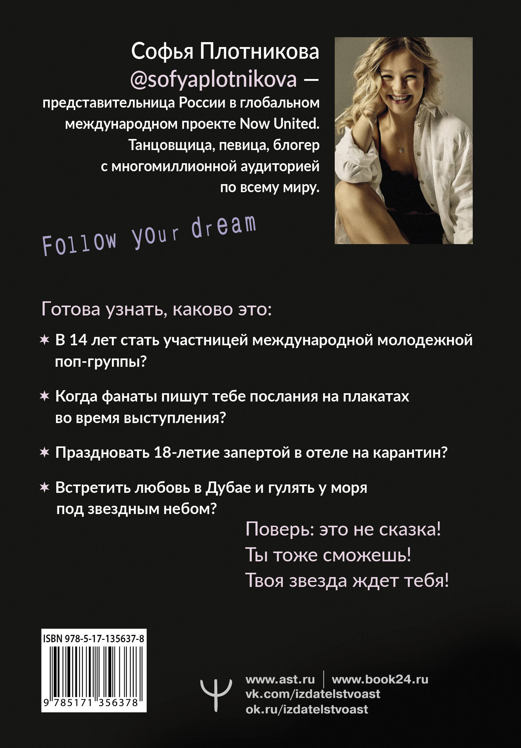 Софья Плотникова - девушка, которая благодаря своему упорству уже в 14 лет стала представительницей России в группе Now United и завоевала мировую любовь. Проект основал Саймон Фуллер - продюсер Spice Girls, Виктории Бекхэм, Клаудии Шиффер, создатель American Idol. "Я не смогу. Не стоит даже пытаться. Мечты сбываются только у тех, у кого есть богатые родители и связи". Отбрось эти мысли! Мечты сбываются у тех, кто верит в свои силы и бежит к звезде, не обращая внимания на преграды и ссадины на коленках. "Зажги свою звезду. Книга о силе воли, щепотке удачи и большой мечте" - это возможность примерить на себя роль популярного артиста. Окунуться в калейдоскоп стран, незабываемые выступления, яркие съемки. Почувствовать поддержку преданных фанатов, впервые влюбиться, встретить настоящих друзей. Книга - будто разговор с близкой подругой, которая верит, что у тебя все получится. А после прочтения поверишь и ты. Готова узнать, каково это: • В 14 лет стать участницей международной молодежной поп-группы? • Когда фанаты пишут тебе послания на плакатах во время выступления? • Праздновать 18-летие запертой в отеле на карантин? • Встретить любовь в Дубае и гулять у моря под звездным небом?