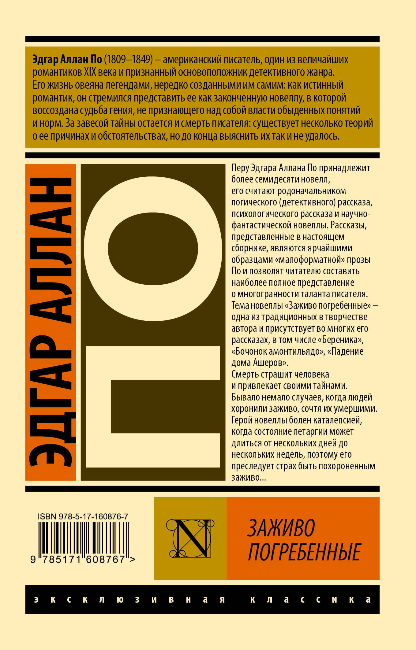 Перу Эдгара Аллана По принадлежит более семидесяти новелл, его считают родоначальником логического (детективного) рассказа, психологического рассказа и научно-фантастической новеллы. Рассказы, представленные в настоящем сборнике, являются ярчайшими образцами "малоформатной" прозы По и позволят читателю составить наиболее полное представление о многогранности таланта писателя. Тема новеллы "Заживо погребенные" - одна из традиционных в творчестве автора и присутствует во многих его рассказах, в том числе "Береника", "Бочонок амонтильядо", "Падение дома Ашеров". Смерть страшит человека и привлекает своими тайнами. Бывало немало случаев, когда людей хоронили заживо, сочтя их умершими. Герой новеллы болен каталепсией, когда состояние летаргии может длиться от нескольких дней до нескольких недель, поэтому его преследует страх быть похороненным заживо...| Издательство | Издательство "АСТ" |