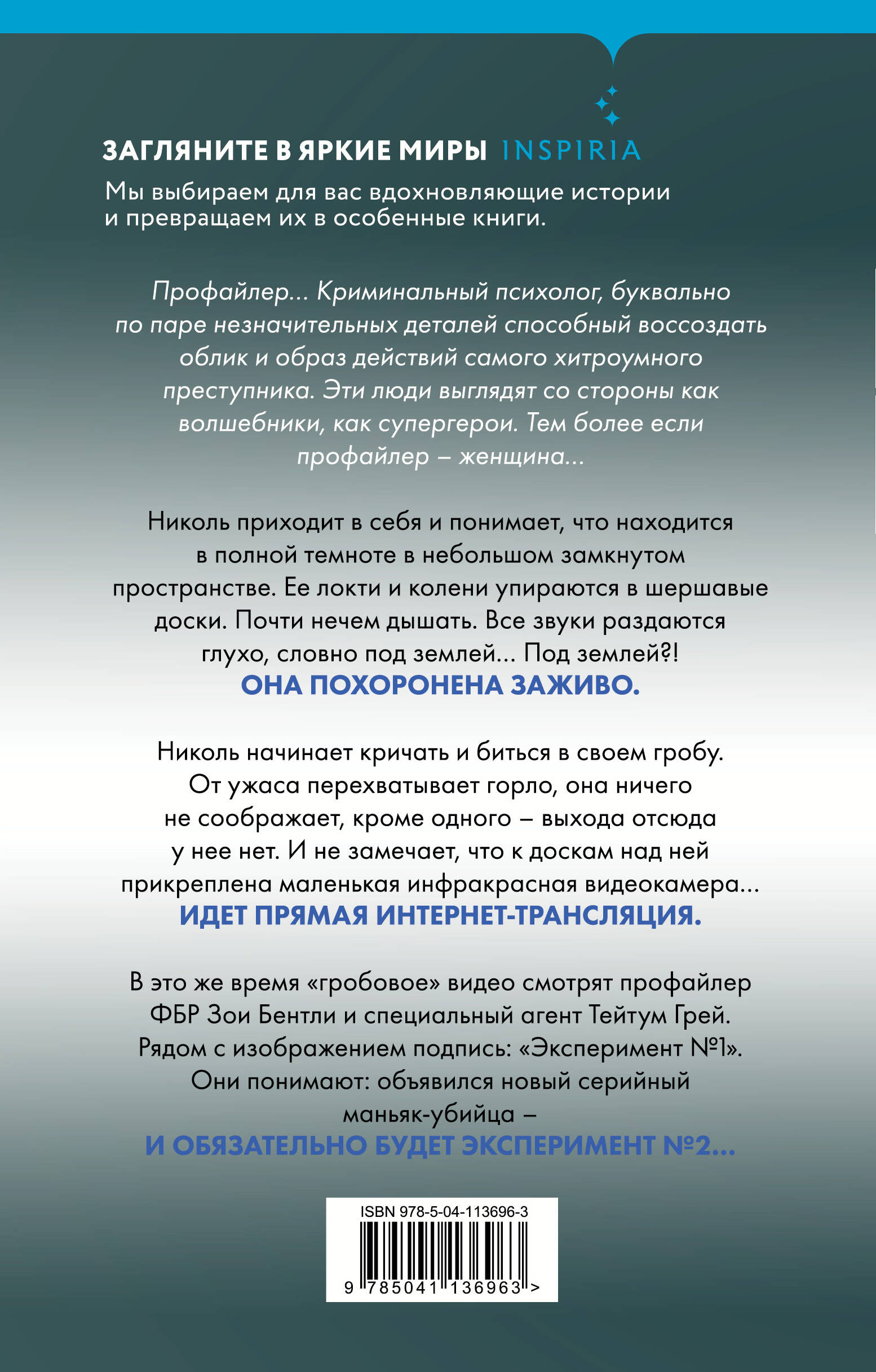 Продолжение триллера «ВНУТРИ УБИЙЦЫ», бестселлера New York Times, Washington Post и Amazon Charts. Все серийные убийцы вырастают из маленьких ангелочков… Он - убийца-экспериментатор. Она - следователь-профайлер. Они обязательно встретятся… Профайлер… Криминальный психолог, буквально по паре незначительных деталей способный воссоздать облик и образ действий самого хитроумного преступника. Эти люди выглядят со стороны как волшебники, как супергерои. Тем более если профайлер - женщина… Николь приходит в себя - и понимает, что находится в полной темноте, в небольшом замкнутом пространстве. Ее локти и колени упираются в шершавые доски. Почти нечем дышать. Все звуки раздаются глухо, словно под землей… Под землей?! ОНА ПОХОРОНЕНА ЗАЖИВО. Николь начинает кричать и биться в своем гробу. От ужаса перехватывает горло, она ничего не соображает, кроме одного - что выхода отсюда у нее нет. И не замечает, что к доскам над ней прикреплена маленькая инфракрасная видеокамера… ИДЕТ ПРЯМАЯ ИНТЕРНЕТ-ТРАНСЛЯЦИЯ. В это же время «гробовое» видео смотрят профайлер ФБР Зои Бентли и специальный агент Тейтум Грей. Рядом с изображением подпись - «Эксперимент № 1». Они понимают: объявился новый серийный маньяк-убийца - И ОБЯЗАТЕЛЬНО БУДЕТ ЭКСПЕРИМЕНТ № 2… *В книгах Inspiria, выпущенных в 2020 году, доступен к прослушиванию только пробный фрагмент аудио. В книгах, выпущенных позже 2020 года, мы предоставляем доступ к полной аудиоверсии.| Издательство | Форс Украина ООО |